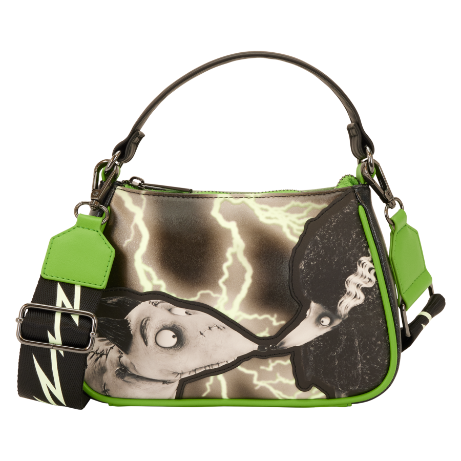 This crossbody bag features Sparky and Persephone from Frankenweenie. They're surrounded by glow-in-the-dark lightning strikes. Turn the bag around to find a swirling design that also glows in the dark. The adjustable crossbody strap has a lightning design on it.