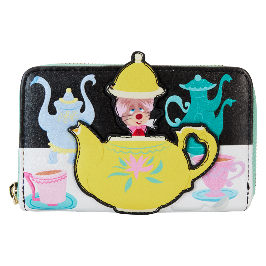 Cut the cake and pour the tea! Toast your unbirthday merrily! There are 364 days to celebrate with our Loungefly Disney Alice in Wonderland Unbirthday Zip-Around Wallet. This sparkly wallet features Disney's sleepy Dormouse, who appears in applique form, coming out of a yellow teapot. Teapots and cups and saucers are set out on the table as well. On the back, teapots in lavender and yellow make an appearance, along with more cups and saucers. Inside, you'll find approximately four slots for holding cards and one clear slot for displaying your ID. The die-cut shape of a teapot adds a splash of fun. Commemorate your unbirthday with this stylish accessory!