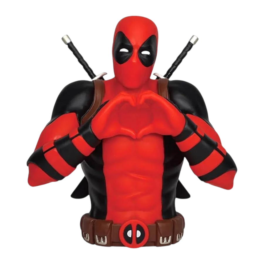 Deadpool with Heart Hands Gesture Bust Bank. About 8 inches tall. Made of PVC. View all