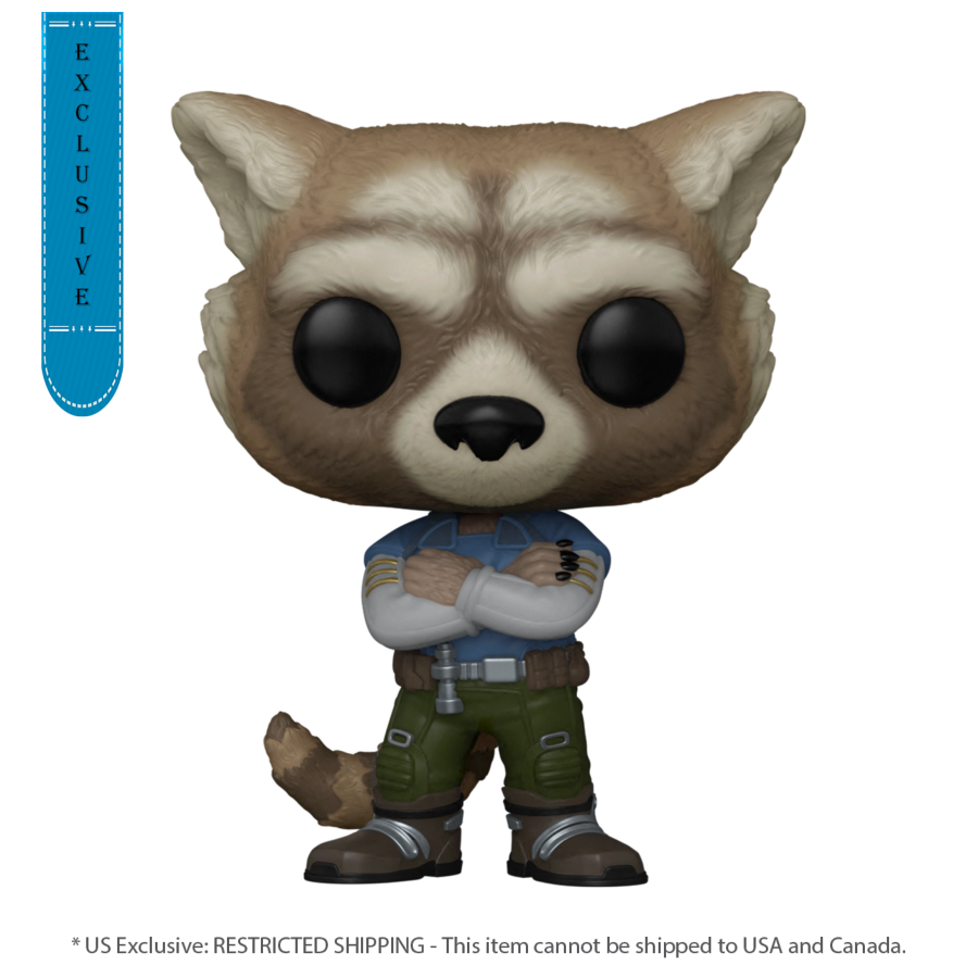 US Exclusive: RESTRICTED SHIPPING - this item cannot be shipped to USA and Canada. Take off on a galactic adventure with this exclusive Pop! Rocket Raccoon on his next mission with his family of misfits. Complete your Guardians of the Galaxy: Volume 3 collection with this genetically-enhanced hero. Careful where you take him though; he's sneaky and has sticky fingers. Vinyl bobblehead is approximately 9 cm tall. View information on Funko Pop! Sizes