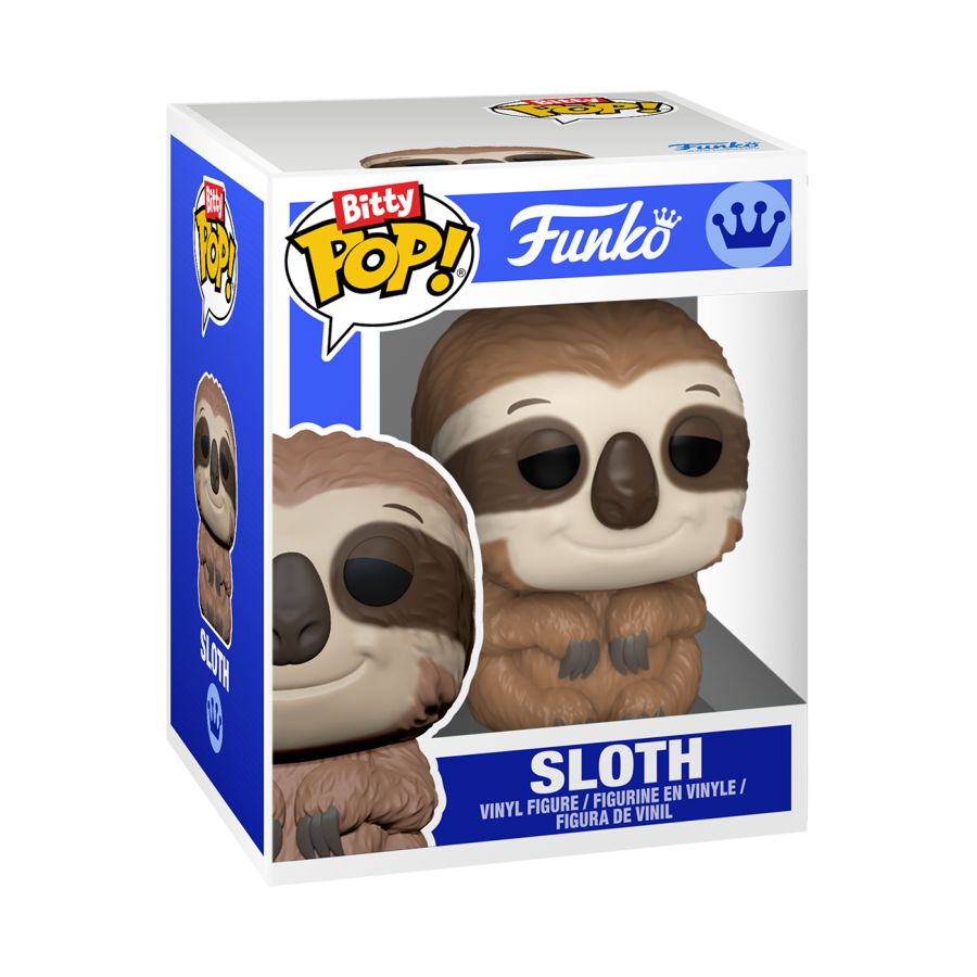 This exclusive 4-pack includes 1 Bitty POP! Sloth and 3 Bitty POP! Pin Cases.