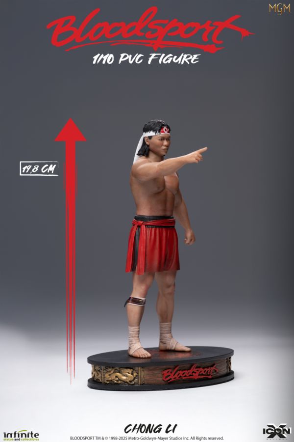 The first releases in the new IconX figure line pay tribute to two martial arts movielegends: Frank Dux and Chong Li, from the cult film Bloodsport.These static 1/10 scale figures are made from high-quality PVC and stand on athemed display base with a cardboard backdrop for maximum impact.Each character includes two interchangeable heads for display variety.Expert sculpting and lifelike paintwork faithfully capture the spirit of this '80s classic.A must-have for fans, collectors, and lovers of action cinema.