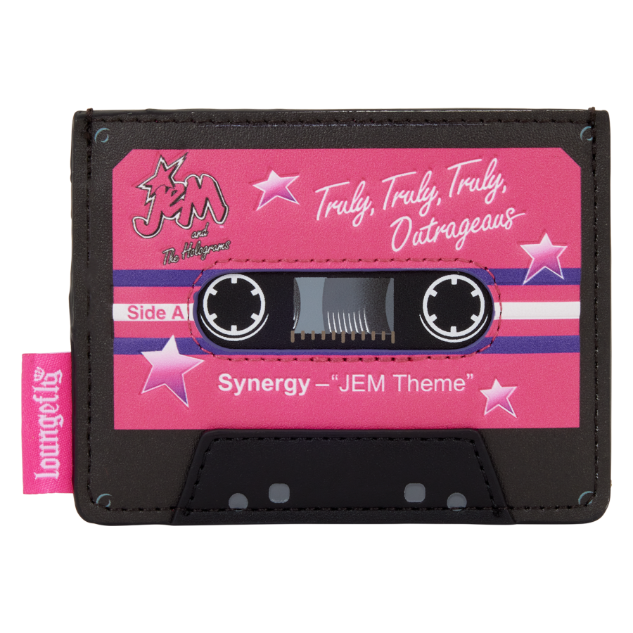 This card holder looks like a Jem and the Holograms cassette that says "Synergy JEM Theme" and "Truly, Truly, Truly, Outrageous." Turn it around to find three card slots!