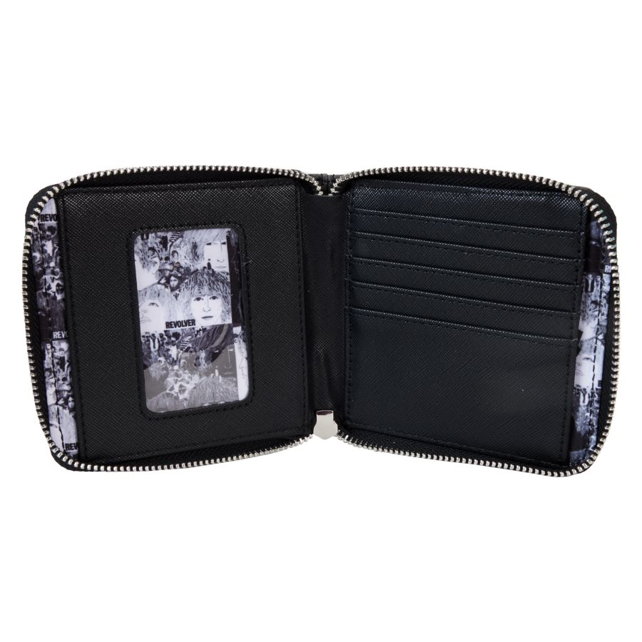 Put a noteworthy spin on your look with our Loungefly The Beatles Revolver Album Zip-Around Wallet. This stylish wallet features the cover art from the album. The printed artwork on the front and on the back reflects the iconic black-and-white drawings and collages of the original cover. Printed cover images are placed in a four-square checkered block with an alternating white background and dark background featuring a trippy photo-negative print. Inside, you'll find approximately five slots for holding cards and one clear slot for displaying your ID. Capture a memorable Beatles moment to harmonize with any outfit.