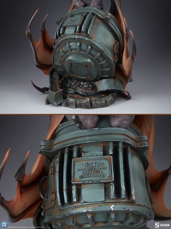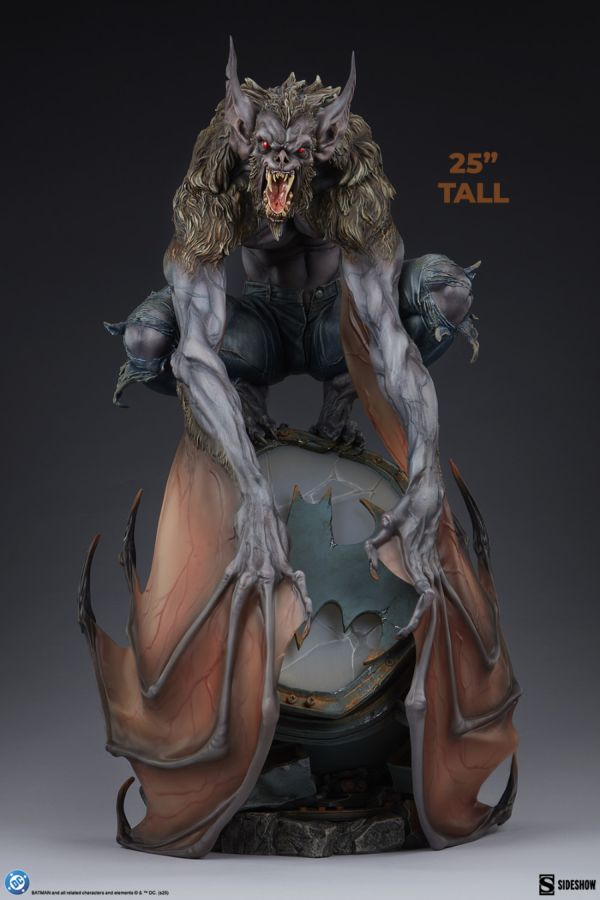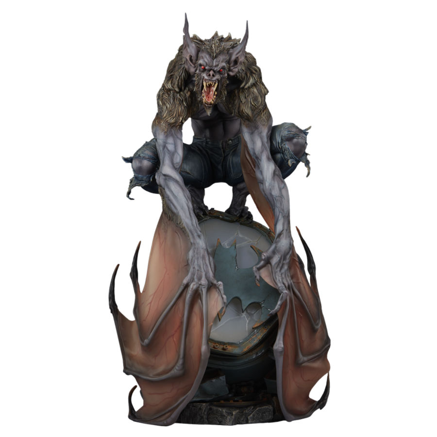 The Man-Bat Premium Format Figure measures 25 inches (63.5 cm) tall, 14.8 inches (36.8 cm) wide, and 13.6 inches (34.6 cm) as this villain perches menacingly on a damaged Bat-Signal. Screeching, the creature beats his sinewy wings against shattered glass and crushed metal. His piercing red eyes have eclipsed all reason and humanity, leaving only a feral thing made of fur, teeth, and fury.