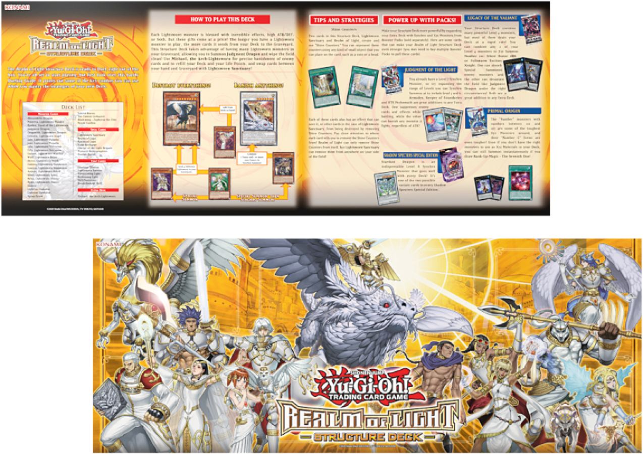 Realm of Light focuses on the Lightsworn Deck theme, which has been a very popular Deck for a number of years; reprints of Lightsworn cards have been the primary drivers for other products. Lightsworn Monsters are blessed with incredible effects, high ATK/DEF, or both; this Structure Deck comes with the most powerful of the Lightsworn forces. Lightsworn have never had Extra Deck monsters before, but that all changes with the all-new Synchro Monster, Michael, the Arch-Lightsworn, capable of banishing any enemy card while refilling your Deck and your Life Points! The Deck also includes 2 Lightsworn Tuner monsters! Finally, a vulnerability of Lightsworn Decks is finally redressed with Lightsworn Sanctuary, a world-premiere Spell Card! The Realm of Light Structure Deck comes with a total of 41 cards: - 2 Ultra Rares - 2 Super Rares - 37 Commons *Name and contents subject to change. Configuration: 8 Decks per Display 12 Displays per Case * Configuration subject to change