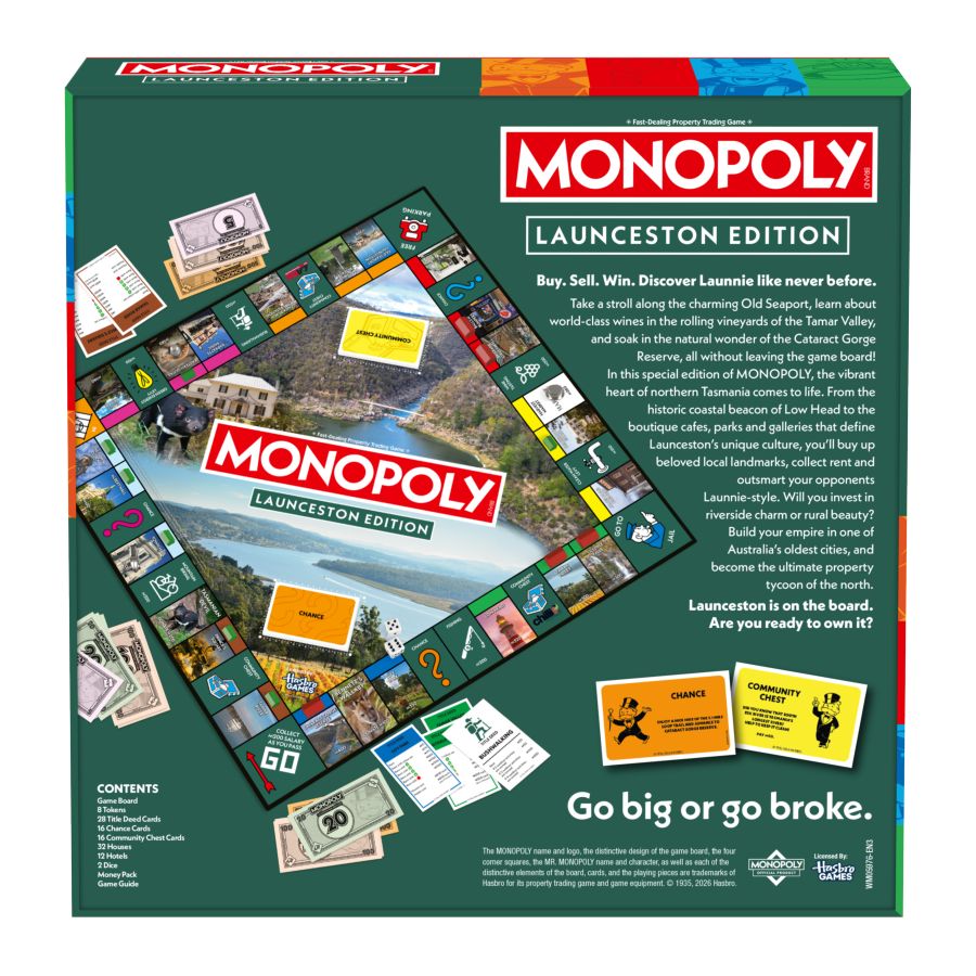 Welcome to the Launceston edition of MONOPOLY! In this special edition of MONOPOLY, the vibrant heart of Northern Tasmania comes to life. You'll buy up beloved local landmarks, collect rent, and outsmart your opponents, Launnie-style. Will you invest in riverside charm, or rural beauty?