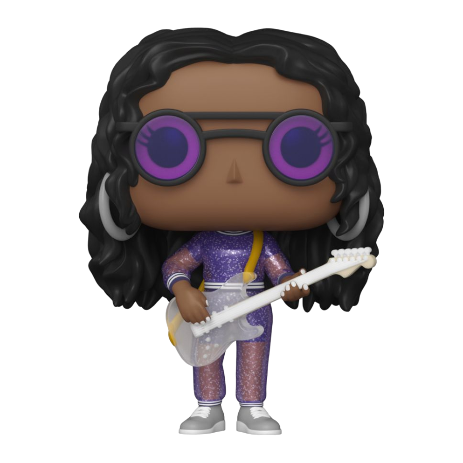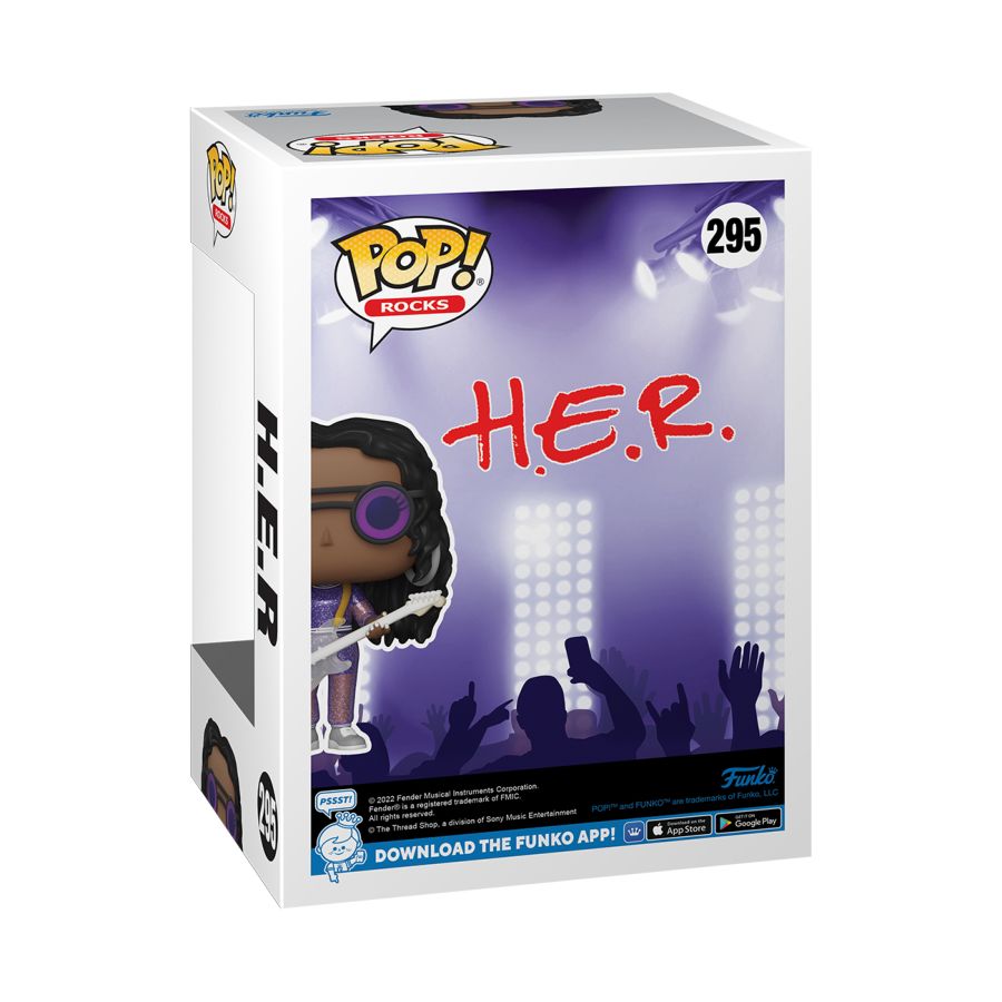 Pop! H.E.R. wears a sparkly, translucent purple outfit with her signature dark shades as seen in her 2019 Grammys performance. In her hands, H.E.R. holds a clear-bodied electric guitar. Who will this artist collaborate with in your music collection?