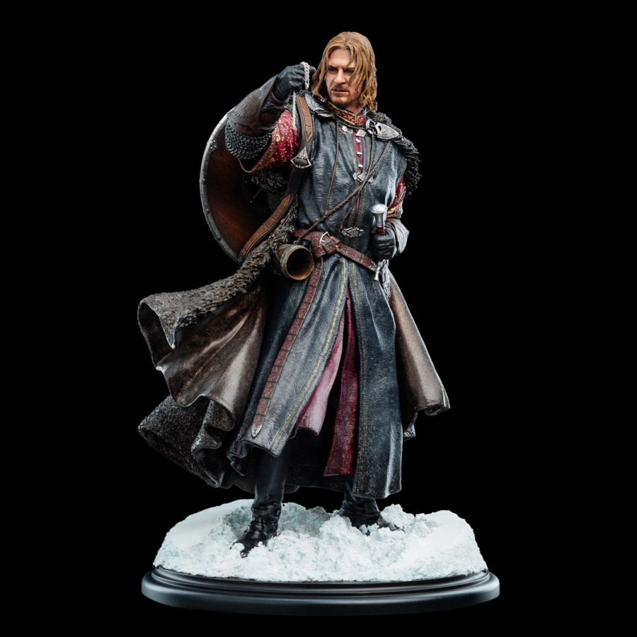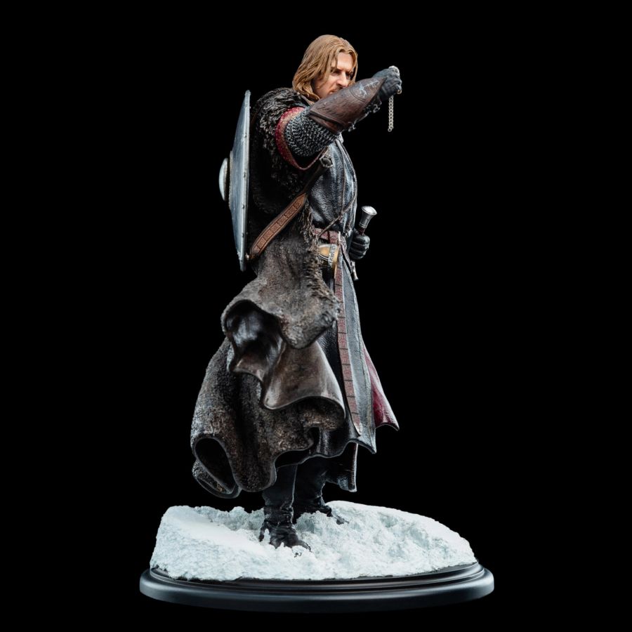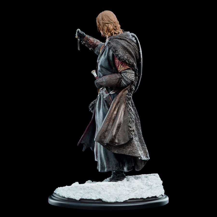 In the heart of Middle-earth's legend lies a moment of quiet peril - Boromir, son of Gondor, standing upon frigid peaks, the One Ring dangling from his fingers. The weight of duty, the lure of power, the flicker of doubt behind steadfast eyes - Weta's artists have captured it all in breathtaking detail.