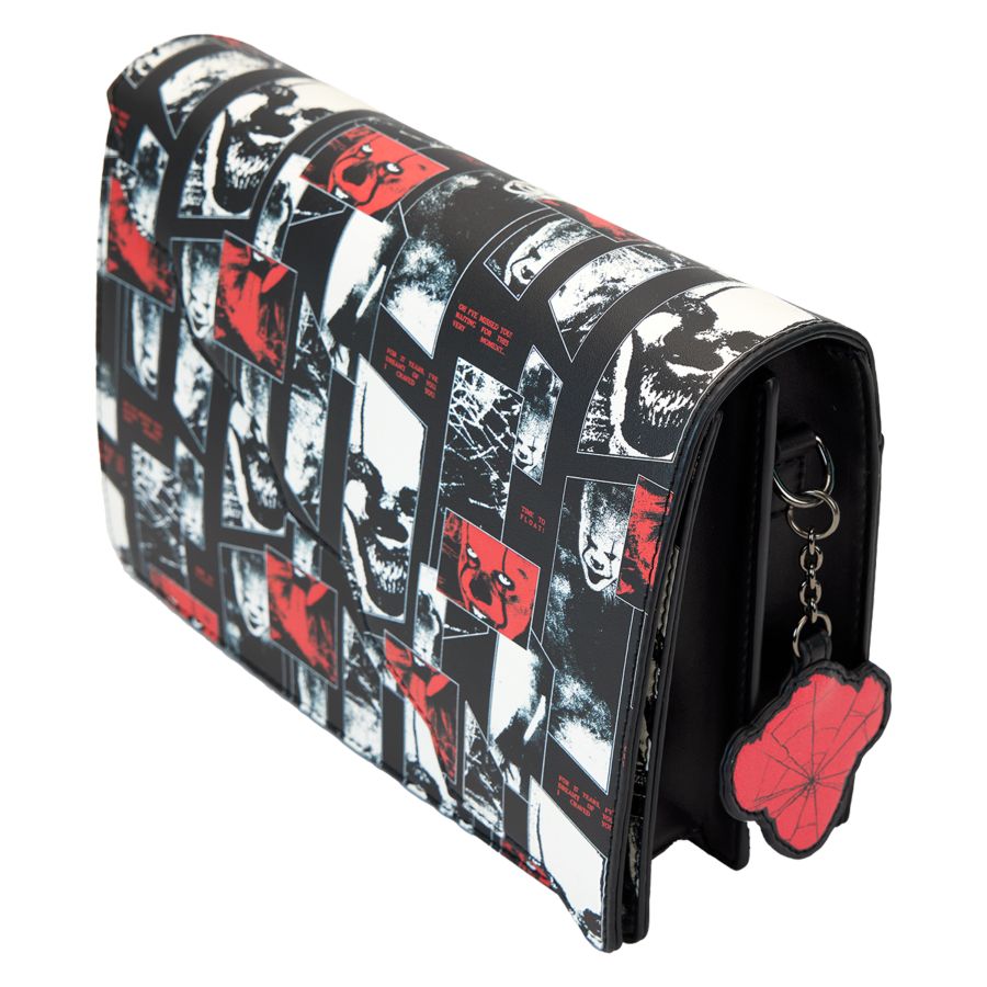 A jagged, die-cut front flap gives the look a fashionably sharp edge, and a vegan leather charm of Pennywise's face, in red, tops off the look.