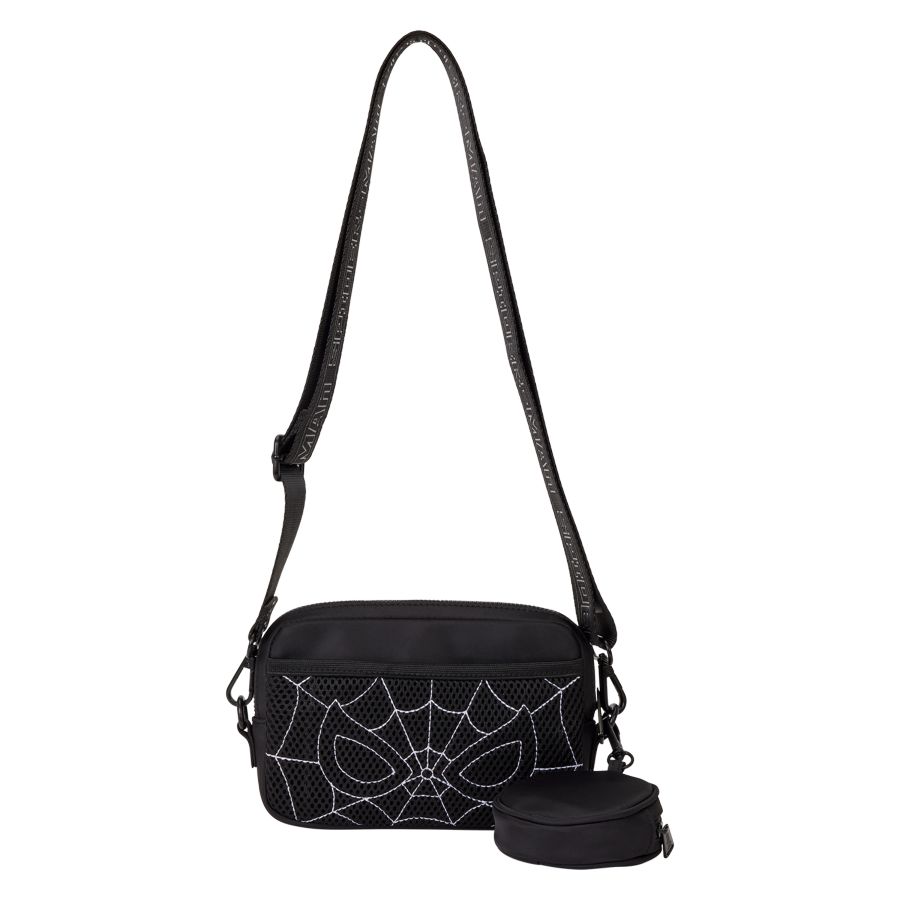 This sling bag features a spiderweb design on one side and Spider-Man's mask on the other. You'll find a detachable coin bag attached that features Spider-Man's mask. "Spider-Man" is written along the strap.