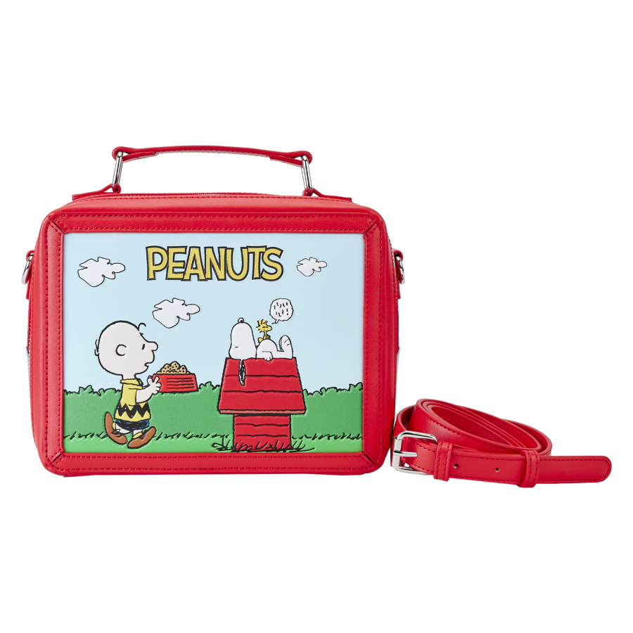 Take the scenic route back to school with the loungefly Peanuts Charlie Brown Lunchbox Crossbody Bag.