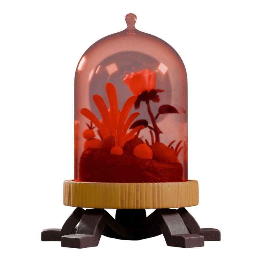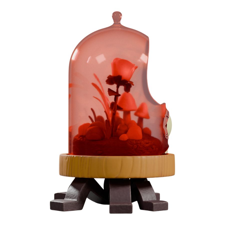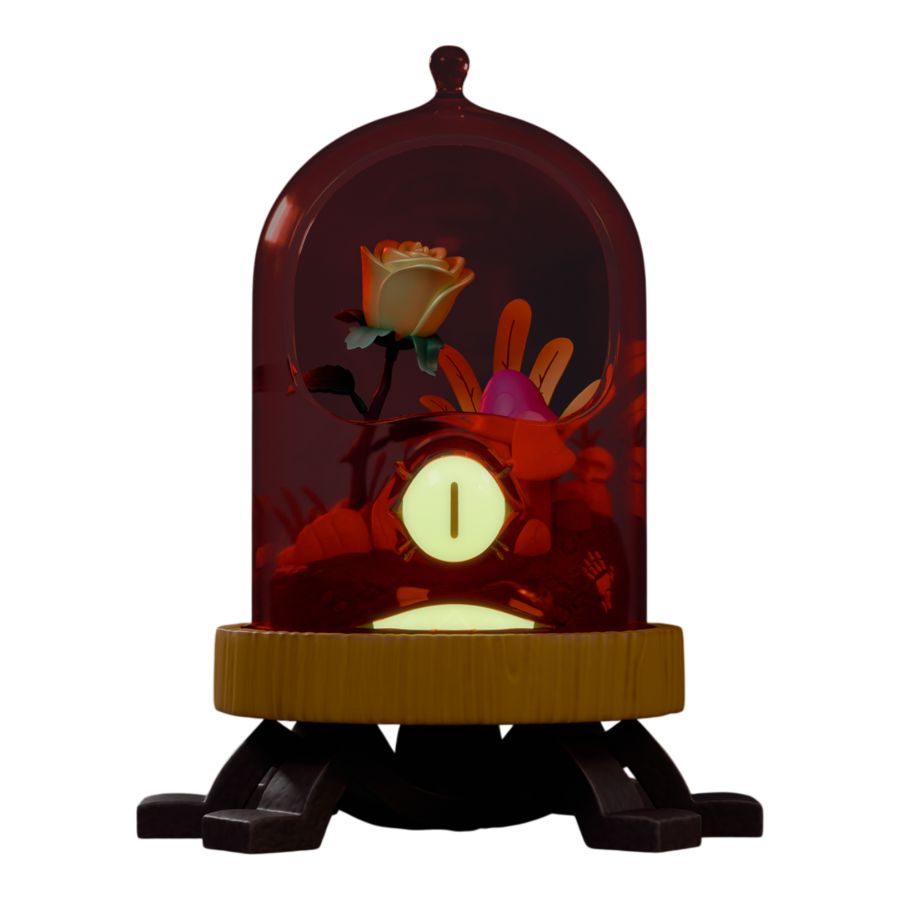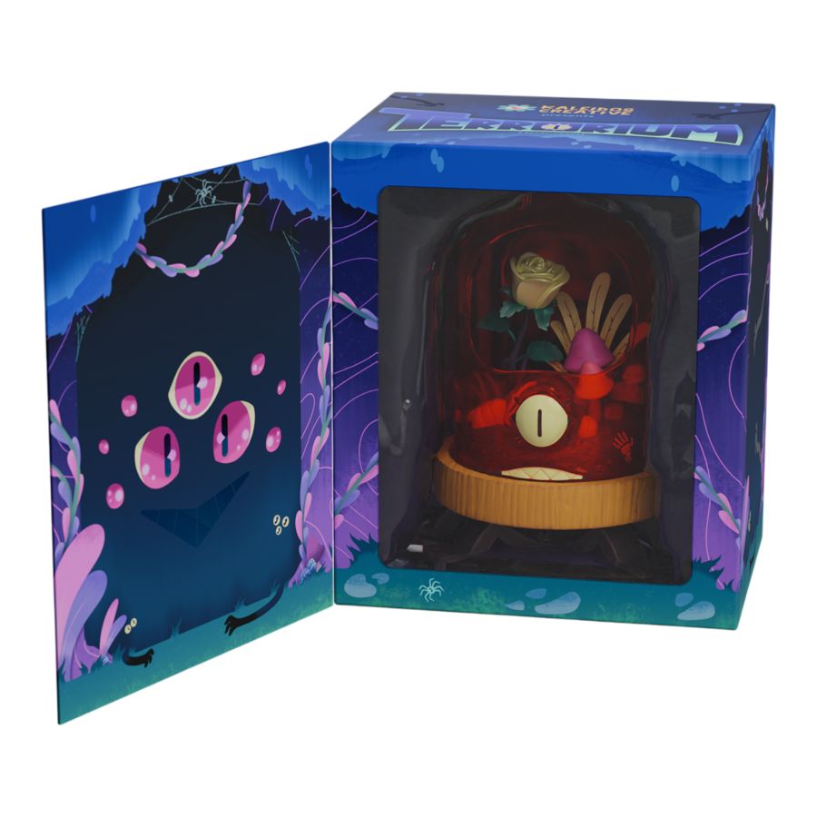 Something isn't right in the heart of the dark forest. The plants grow wild and wicked there, twisting the world around them. Be careful, you will be watched. This is a collectible window box figure (non-blind). Plastic cloche is removable. Eyes and Teeth glow in the dark.