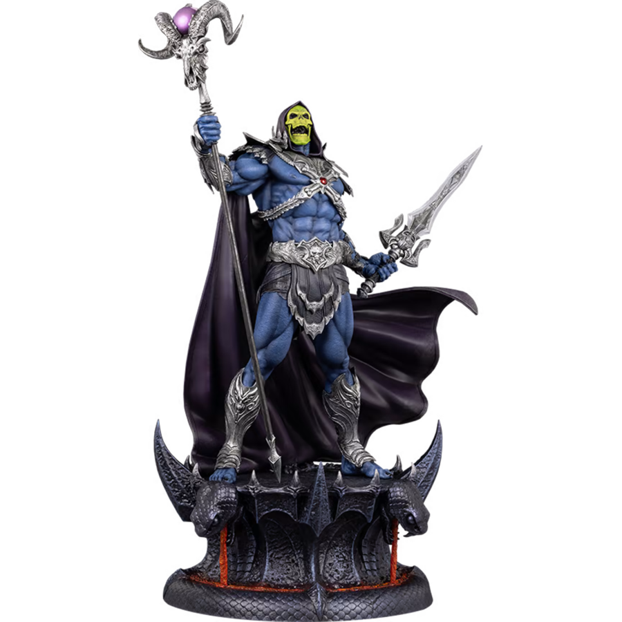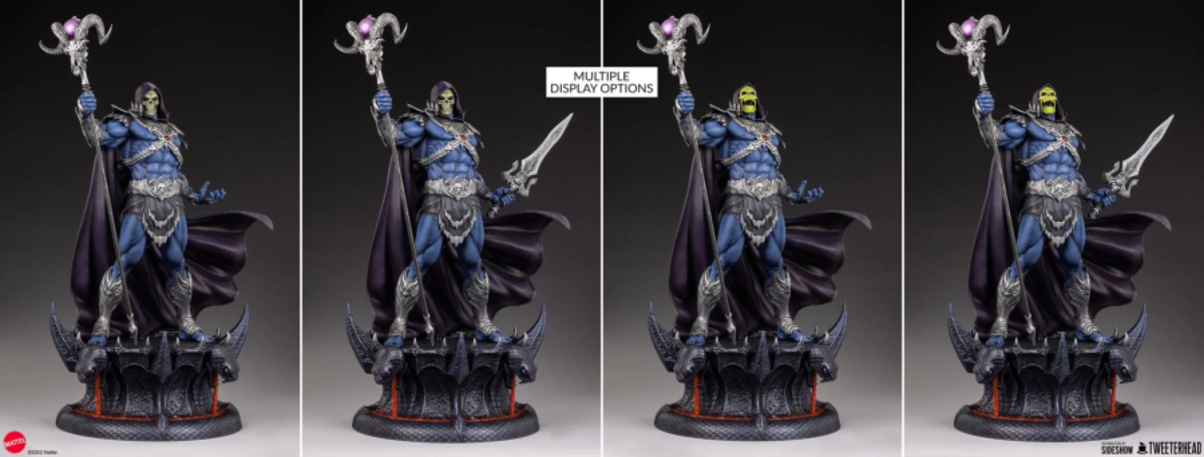 "I must possess all, or I possess nothing." Tweeterhead present the Skeletor Legends 1:5 Scale Maquette, the ultimate evil to command the Masters of the Universe Legends collection. This iconic super-villain is sculpted to menacing perfection with multiple display options for fans to explore. The Skeletor Maquette measures 25" tall and 15.4" wide, lording over a Snake Mountain base adorned with two serpent heads pouring molten lava. He wields the Havoc Staff, topped with a silver ram's skull and purple crystal ball. Despite his skeletal visage, the villain has a muscular blue body protected by ornate silver armor and a sculpted purple cape that gives him an added air of malevolence and magnificence. The polyresin Skeletor Maquette includes a number of swap-out features allowing fans to craft their perfect display of power. Choose between the classic portrait with a cackling expression or a modern portrait with a grimacing expression. Skeletor also features swap-out left hands - one in a clawed gesture and one holding the Power Sword. When holding the Power Sword, the figure measures 16.5" wide.
