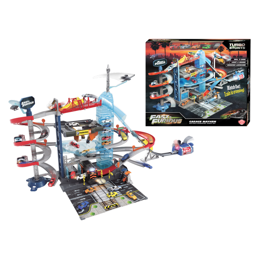 Take Fast & Furious action to the next level with the massive Garage Mayhem Track Set by Dickie Toys. Designed as an ultimate city stunt and racing hub, this feature-packed playset delivers towering height, multiple track routes, and relentless high-speed action inspired by the Fast & Furious universe.