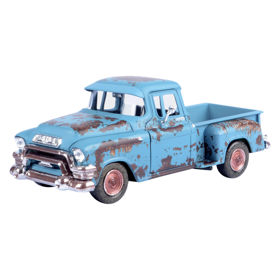 Step back into classic Americana with the Weathered Treasures 1:24 scale 1955 GMC Blue Chip Pickup by Motormax. Featuring an authentic weathered finish, this diecast model captures the rugged charm of a hardworking vintage truck thats seen decades of road and labour.