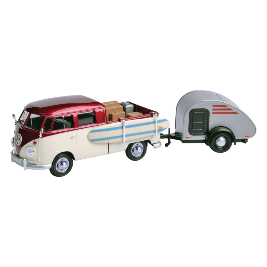 The Volkswagen Collection 1:24 Scale VW Type 2 Pick-Up & Trailer Die-Cast Vehicle pairs classic utility styling with a matching trailer for added display appeal. Featuring detailed craftsmanship and durable die-cast construction, its perfect for display or collection.