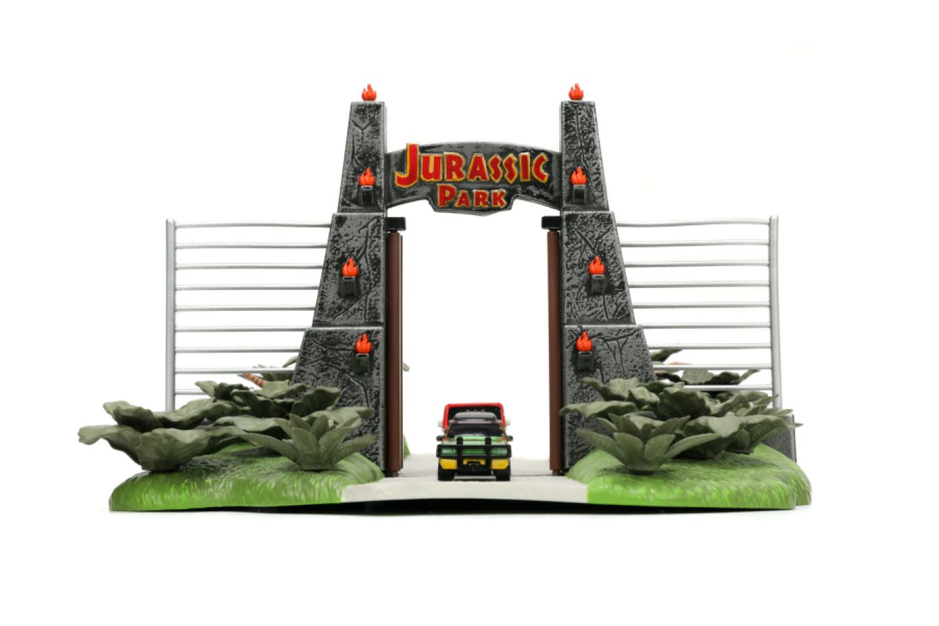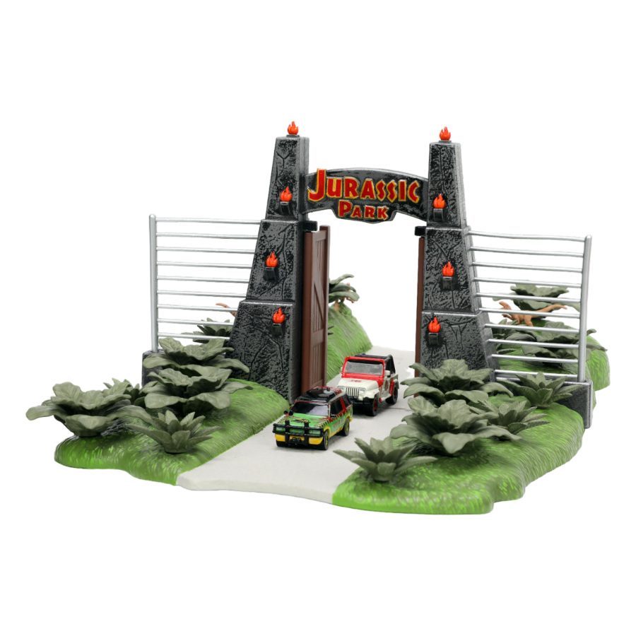 Celebrate the 30th anniversary of Jurassic Park with this Nano Hollywood Rides Nano Scene, featuring two 1.65" nano scale vehicles from the film: a Jeep Wrangler and a Ford Explorer. This beautifully sculpted diorama is crafted with incredible attention to detail, capturing the iconic scene at the Jurassic Park gate. Assemble the dinosaurs and plants around the gate to recreate the quintessential moment of the film or make your own prehistoric adventures. Whether you're a fan of the classic film or just love collecting miniature models, the Jurassic Park Nano Hollywood Rides Nano Scene is a must-have for any collection.