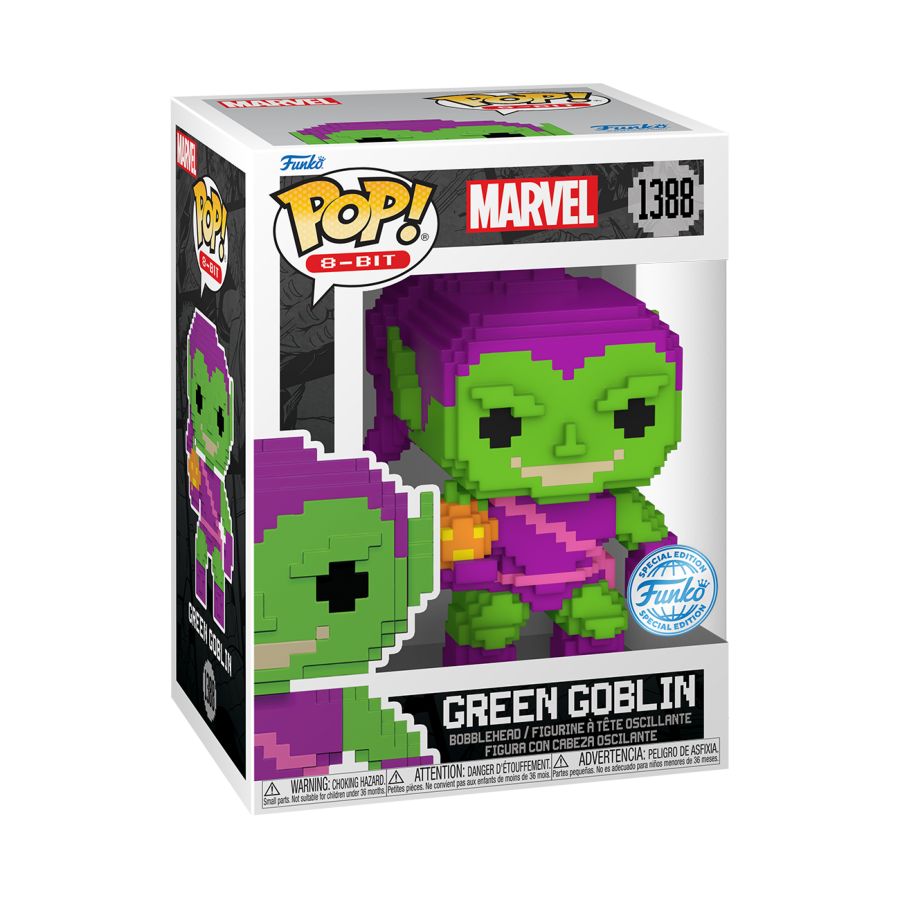 Thwart the heroic efforts of Spider-Man with this exclusive 8-Bit Pop! Green Goblin! This devious villain is eager to wreak havoc in your Marvel collection. Complete your lineup when you welcome 8-Bit Pop! Green Goblin into your home! Vinyl bobblehead is approximately 4-inches tall. View all