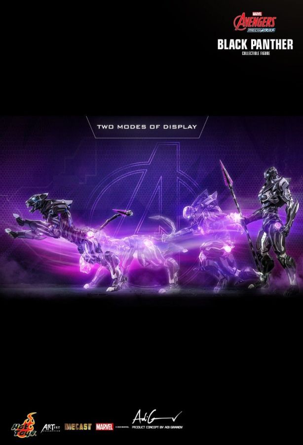 In the face of an overwhelming threat, Earth's Mightiest Heroes have assembled a powerful new set of tools! T'Challa is transforming from King of Wakanda, levelling up with the Mech Strike armours, with each mech designed for a specific hero. Mounted with new jet-powered talons and Mech shield, the incredible mech suit is powered by Wakanda's most valuable and rarest resource, vibranium. Sideshow and Hot Toys are proud to introduce the first collectible from Marvel's Avengers Mech Strike lineup – Black Panther as a die-cast collectible figure with 2 ways to display. Based on illustrator Adi Granov's unique perception of the Black Panther armour and the stylish intersection of the suit in panther mode. Designed to capture the reimagined appearance of the Black Panther Mech Strike armour, the die-cast figure measures 35cm tall and features a newly crafted helmet head with LED-light up function; detailed recreation of a tech advanced suit in matte black, silver and purple highlighted with purple luminous reflective effect patterns; LED light-up function design on eyes, chest, and palms; comes with weapons including spear, shield, sword, multiple pairs of interchangeable hands, and a figure stand. The Mech Strike armour figure also enables "Panther Mode" display by adopting parts such as LED lighted panther head, paws, and an articulated tail. Kickstart your Mech Strike collection with the Black Panther Mech Strike Figure today! The Black Panther Collectible Figure features: - Captures the reimagined appearance of Black Panther from Marvel ’s Avengers: Mech Strike by artist Adi Granov - One (1) finely crafted helmet head with LED light-up function (white light, battery operated) - Approximately 35 cm tall - Over 30 points of articulation - Contains diecast material - Special features on armor: - Matte black, silver and purple colored mech armor design - Specially applied luminous reflective effects patterns in purple - Cockpit hatch on the figure ’s body can open and close; includes a pilot miniature (non-detechable) - LED-light up function design equipped on eyes, chest, and palms (white light, battery operated) - LED-light up function design equipped around shoulders and thighs (purple light, battery operated) - Six (6) pieces of interchangeable hands including: - One (1) pair of fist - One (1) pair of weapon holding hands - One (1) pair of hands with articulated fingers and light-up repulsors (white light, battery operated) - Includes additional parts for Panther mode: - One (1) LED lighted head with neck (white light, battery operated) - Four (4) paws - One (1) articulated tail - Articulations on waist armor which allow flexible movement Weapons: - One (1) spear - One (1) shield - One (1) sword Accessory: - A themed figure stand with a character nameplate View all
