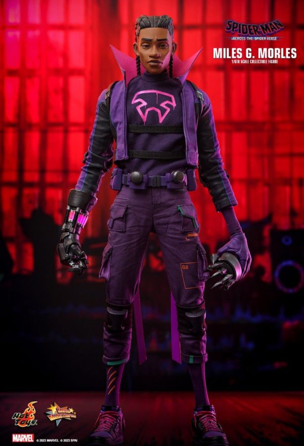 "I'm Miles Morales. But you can call me The Prowler." - Miles G. Morales Miles G. Morales is the alternate reality version of Miles, who grew up completely differently from him. This version of the character was never bitten by a radioactive spider and doesn't have any superpowers. But he has fallen into the role of becoming the vigilante the Prowler, under the tutelage of his uncle Aaron. The highly-detailed figure includes a newly developed head sculpt with separate rolling eyeball system and a masked head with LED light up function in purplish red. His futuristic outfit in purple tone is beautifully recreated through a mixed media costume, from the jacket with tall standing collar, backpack, printed shirt, pants and the sculpted utility belt. The figure also includes a pair of LED lighted Prowler gauntlets and sneakers with luminous reflective effect to complete his look as seen in movie. More detailed accessories include spray cans, attacking effect, comic art backdrop, a pipe pole with chains as diorama accessory, and a themed figure stand. The 1/6th scale Miles G. Morales Collectible Figure specially features: - Authentic and detailed likeness of Miles G. Morales in Spider-Man: Across the Spider-Verse - One (1) newly developed head sculpt with separate rolling eyeballs - One (1) interchangeable LED-lighted masked head (reddish purple light, power operated) - Detailed braided hair sculpture - Newly developed specialized body with 30 points of articulation - Approximately 29 cm tall - Four (4) pieces of interchangeable hands including: - One (1) pair of accessory holding hands - One (1) open left hand - One (1) right fist - Each piece of head sculpt is specially hand-painted Costume: - One (1) newly tailored purple jacket with backpack - One (1) purple shirt - One (1) purple colored under-suit - One (1) utility belt - One (1) pair of purple pants - One (1) pair of LED-lighted sneakers with specially applied luminous reflective effect Weapons: - One (1) pair of LED-lighted Prowler gantlet claws with articulated fingers (reddish purple light, USB power operated) Accessories: - Two (2) spray cans - One (1) attacking effect (attachable to arm and leg) - One (1) set of pop art style character backdrop - One (1) pole with chains diorama accessory - A dynamic figure stand with movie logo and character name View all
