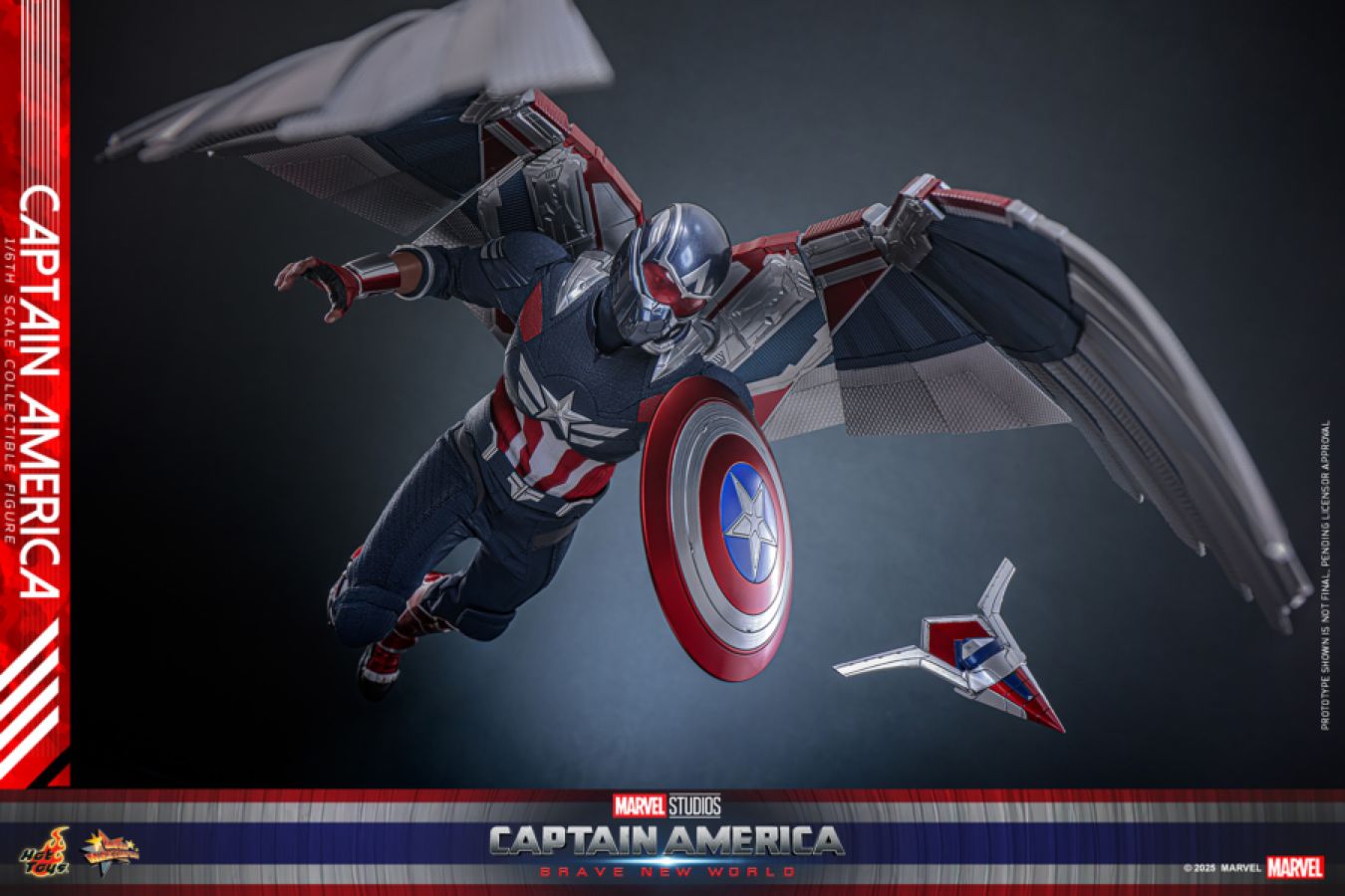 Officially picking up Captain America's shield, Sam Wilson has a new role in the MCU. Facing new challenges and enemies, Sam, as Captain America, has to define leadership and embrace the new weight of responsibility. Following Thaddeus Ross' election as the U.S. president, Sam Wilson finds himself at the center of an international incident, and he must stop the masterminds behind this global conspiracy. Ahead of Captain's theatrical debut, Hot Toys is pleased to introduce Captain America in 1/6th scale, bringing the movie to life for fans. Faithfully crafted based on Anthony Mackie's portrayal of Captain America in Captain America: Brave New World, the new 1/6th scale Captain America Collectible Figure features a newly developed head sculpt with separate rolling eyeballs and a pair of aviation goggles, a helmeted head, a finely tailored red, blue, white tactical Cap's suit, a flight backpack, a newly painted Captain America shield with silver star emblem, his signature set of newly painted mechanical wings with articulation function, a Redwing drone and a specially designed dynamic figure stand with character nameplate. The 1/6th scale Captain America Collectible Figure specially features: - Authentic and detailed likeness of Anthony Mackie as Captain America in Captain America: Brave New World - One (1) newly developed Captain America head sculpt with separate rolling eyeballs - One (1) newly developed helmeted head sculpt - Movie-accurate facial expression with detailed wrinkles, skin texture and beard - Greatly detailed buzz cut black hair sculpture - Approximately 30 cm tall - Body with 30 points of articulation - Eight (8) pieces of interchangeable gloved hands including: - One (1) pair of shield throwing hands - One (1) pair of shield holding hands - One (1) pair of open hands - One (1) pair of fists - Each piece of head sculpt is specially hand-painted Costume: - One (1) newly tailored red, blue, white colored tactical suit with embossed pattern and star emblem in chest - One (1) pair of new blue colored embossed patterned pants with knee pads - One (1) new metallic silver and blue colored belt - One (1) pair of new metallic silver and red colored forearm guards - One (1) pair of new metallic silver and red colored calf guards - One (1) pair of new metallic red and black colored boots - One (1) flight backpack Weapons: - One (1) newly painted circular Captain America shield with silver star emblem Accessories: - One (1) pair of aviation goggles - One (1) set of newly painted mechanical wings with articulations (opened to approximately 80cm wide) - One (1) Redwing drone - A specially designed dynamic figure stand with character nameplate View all