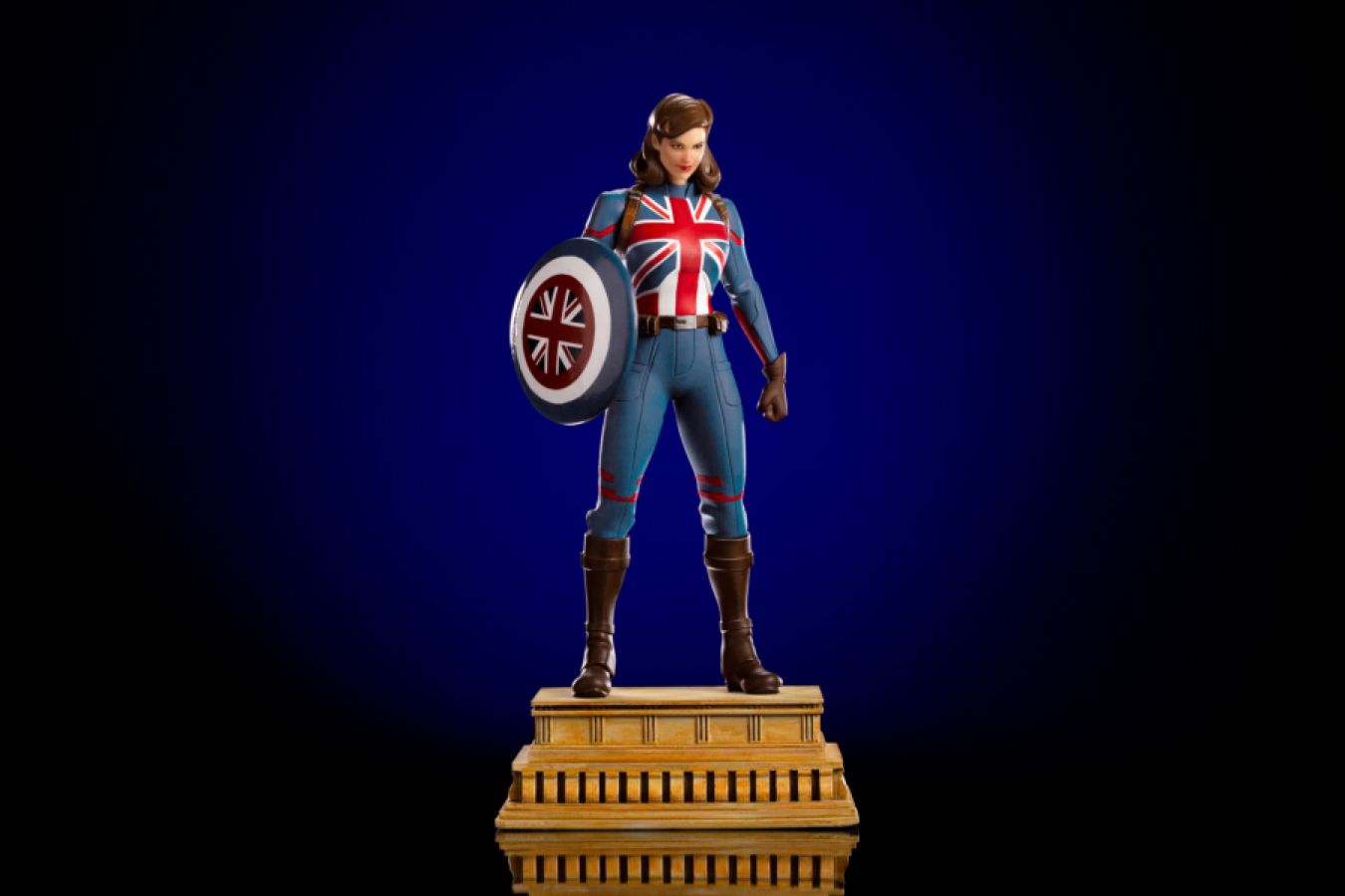 Over a base inspired by the Brandenburg Gate, the British heroine watches a fleet of vehicles belonging to the subversive paramilitary terrorist organization, HYDRA. Wearing her uniform representing the UK, she prepares to launch her vibranium shield against enemy forces on her first mission to retrieve the cosmic artifact Tesseract and capture the scientist, Arnim Zola. As in the first episode of the anthological animated series "What If...?, created for Disney+ streaming by Ashley C. Bradley, Iron Studios presents the statue "Captain Carter - What If...? - Art Scale 1/10" featuring the first Avenger of an alternate timeline from the Marvel multiverse. Exploring various timelines of the multiverse, the extraterrestrial, known as The Watcher tells in the episode "What If... Captain Carter Were The First Avenger?" the story of agent Peggy Carter taking on the role of a heroine who once belonged to Steve Rogers, in an alternate reality. Here, in World War II, when Rogers, the original candidate for Project Rebirth, is injured by a HYDRA spy, Carter volunteers to receive the Super Soldier Serum, acquiring enhanced skills at super-human levels. Wearing a uniform with the colors of the Union Jack (the national flag of the United Kingdom), after earning the rank, uniform, and shield, she assumes the name Captain Carter and starts to lead the allied forces against HYDRA. As voiced by Hayley Atwell View all