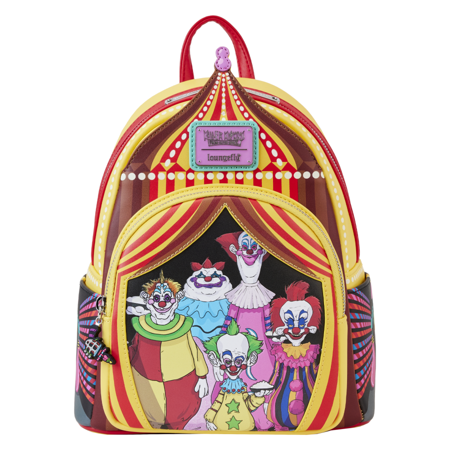 Bring along the loungefly MGM Studios' Killer Klowns from Outer Space Mini Backpack. Get ready for some out-of-this-world adventures with an accessory packed with fun details. Applique features bring the circus-tent top to life with lights over the dome that glow in the dark! Just behind the curtain, over the front-zipped pocket, you'll find your favourite creepy Killer Klown characters, including Rudy, Shorty, Fatso, Slim, and Bibbo. A silicone zipper charm of a ray gun completes the look. Side pockets reveal a sweet, yet sinister secret: cotton candy cocoons all hung in a row. On the back, someone (or something) has cast an eerie puppet shadow on the outside of the tent. Even the shoulder straps feature a surprise: printed appliques of a ray gun shooting popcorn. Get in on the act and celebrate the 35th anniversary of this classic sci-fi film.