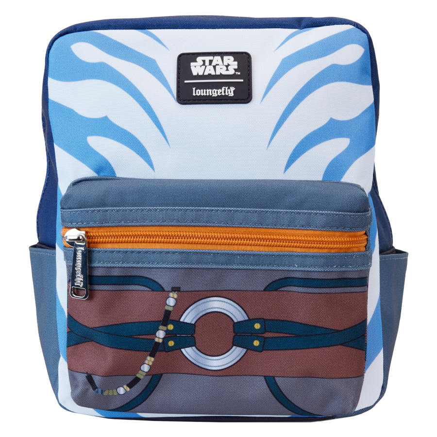 The Loungefly Ahsoka Cosplay Nylon Mini Backpack has adjustable shoulder straps, shiny silver hardware, and features printed details. Take note of the Loungefly-branded inside lining.