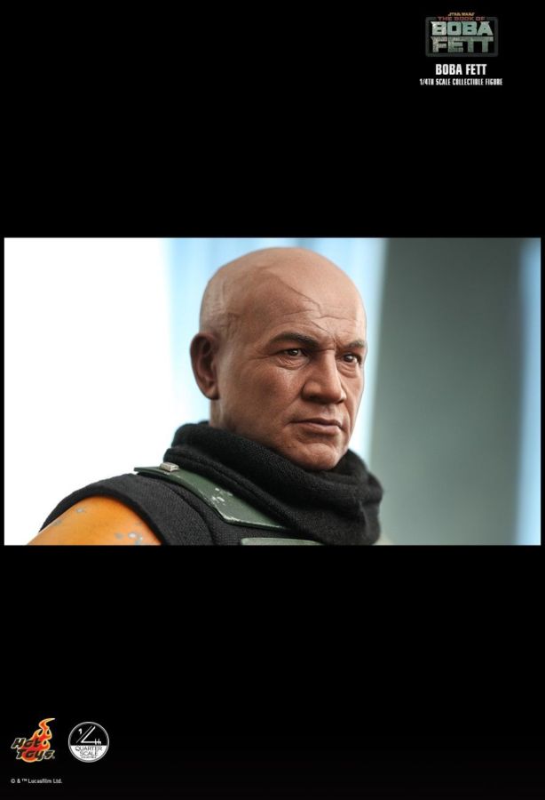 "I know you sit on the throne of your former employer." Every galaxy has an underworld. In The Book of Boba Fett, Star Wars fans are introduced to Boba Fett ’s ™ journey as the new daimyo of the criminal empire on Tatooine after he usurped power from Bib Fortuna ™. However, this underworld proves to be dangerous and Fett needs to prepare to fight for his new position... Today Hot Toys is pleased to introduce a new and remarkable 1/4 scale collectible figure of Boba Fett! The highly-accurate quarter scale figure is skillfully crafted based on the appearance of the character from The Book of Boba Fett. It stands approximately 45cm tall, featuring a newly developed head sculpt with extraordinary likeness, meticulously made armor and interchangeable helmet, specially tailored outfit, an attachable jetpack, blaster rifle, flamethrower effect, miniature holograms and a display base. This amazing 1/4 scale figure will be a great addition to your display! The 1/4th scale Boba Fett Collectible Figure specially features: - Authentic and detailed likeness of Temuera Morrison as Boba Fett in Star Wars: The Book Of Boba Fett series - One (1) newly crafted Boba Fett Mandolorian helmet with articulated rangefinder - One (1) newly developed head sculpt with highly-accurate facial expression and detailed skin texture - Specially applied distress effects on armor, weapons, and accessories - Body with over 30 points of articulations - Approximately 45cm tall - Seven (7) pieces of interchangeable gloved hands including: - One (1) pair of relax hands - One (1) pair of hands for holding weapons - Three (3) gesture hands - Each piece of head sculpt is specially hand-painted Costume: - One (1) Boba Fett Mandolorian armor vest - One (1) finely tailored black colored undersuit - One (1) leather-like brown belt with ammo clips and pistol holster - One (1) pair of reddish brown colored gauntlets - One (1) pair of yellow knee guards - One (1) pair of leather-like brown colored boot covers - One (1) pair of black boots Weapons: - One (1) blaster rifle - One (1) pistol Accessories: - One (1) jetpack with distressed effects (magnetic function equipped) and detachable rocket - One (1) flamethrower effect accessory (attachable to gauntlet) - One (1) Boba's palace hologram - One (1) Boba Fett ’s Starship hologram - Specially designed figure stand with Star Wars logo and character nameplate View all