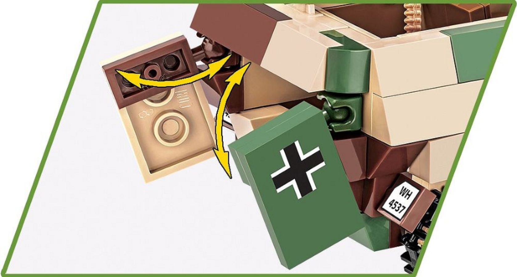 The COBI "Stummel" armoured personnel carrier has been developed in 1:35 scale to match the rest of the Historical Collection. The model consists of 485 high-quality elements, including blocks with durable prints. Particularly noteworthy is the beautiful, colourful block camouflage. The vehicle is equipped with moving wheels and real tires. Tracks consisting of realistic block links work and behave like the real Stummel when moving the vehicle. The opening rear door, cannon and additional accessories make the transporter more attractive and fun to play with.