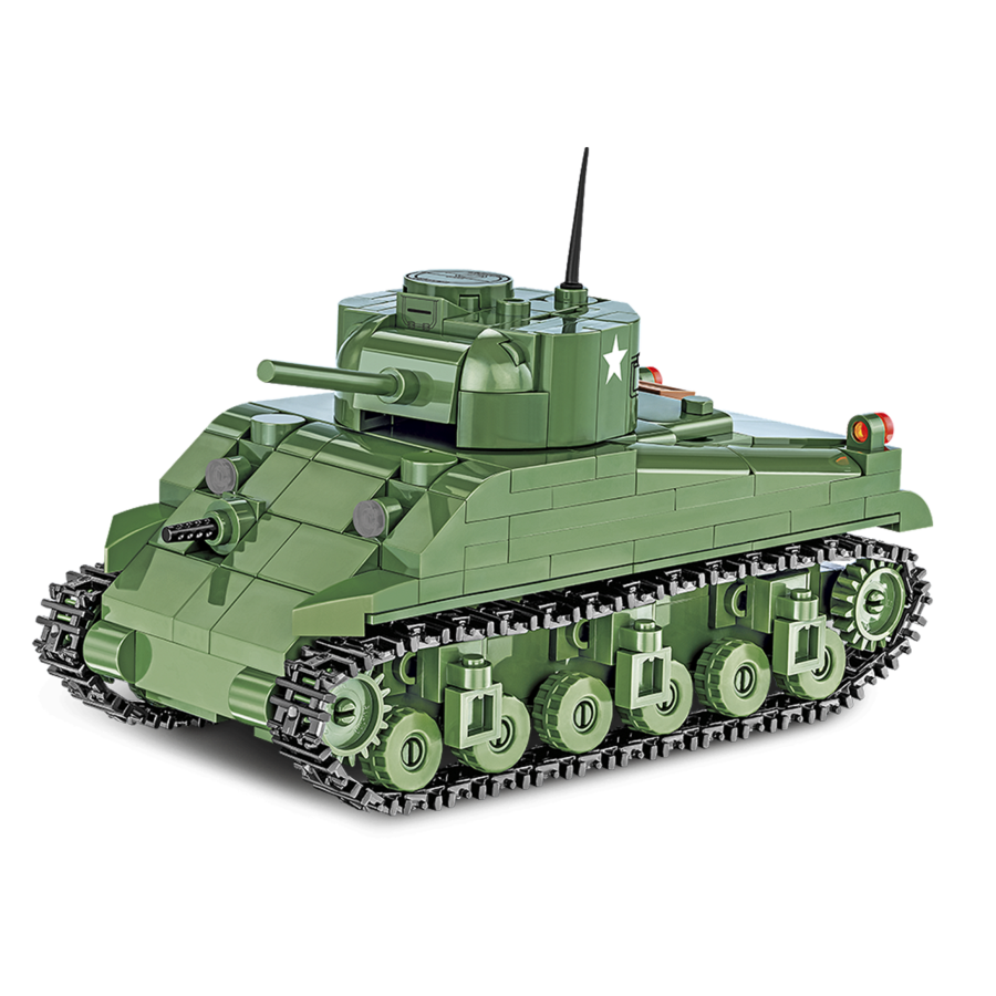 A miniature Sherman M4A1 vehicle made of COBI construction blocks was produced in the 1:48 scale of models. It is easy to build and perfect for the beginning of an adventure with Polish COBI building blocks. It has a movable cannon, a rotating turret and a working caterpillar traction. All graphic details are high-quality prints that do not wear off even during intense play. The advantage is the design that uniquely reflects the original shapes of its historical inspiration. Thanks to our small series, your collection will fit anywhere! Our tanks are perfect for mature enthusiasts of military technology and everyone, regardless of age, who loves history and construction!
