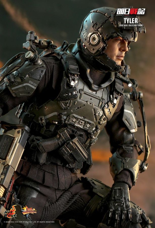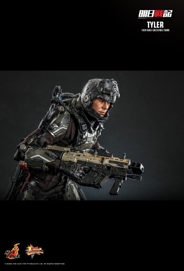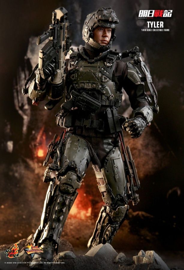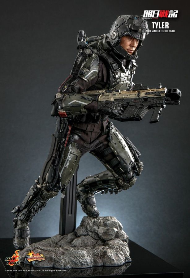Amidst the backdrops of the future, the world is under extreme environmental crisis, and a meteorite brings an extremely dangerous alien life form to Earth. Warriors in their mech machines are tasked with destroying the invaders and saving the planet, yet the surviving soldier Tyler discovers an even bigger conspiracy. Based on the long-awaited sci-fi movie, Warriors of Future, Hot Toys is proud to introduce Tyler in the extremely intricate exosuit as our latest 1/6th scale collectible figure. Meticulously crafted based on the appearance of Louis Koo as Tyler in the movie, the figure features a newly developed LED light-up helmeted head sculpt with impressive likeness, his dark green, black exosuit and mechanical exoskeleton weathered from battle, LED-lighted torch on shoulder, gear holsters on the delicate suit with greatly-detailed weapons such as heavy machine gun, blade, dagger, pistol, grenades, and a rocky themed diorama figure base. Tyler in exosuit is now here to rescue your collection today! The 1/6th scale Tyler Collectible Figure specially features: - Authentic and detailed likeness of Louis Koo as Tyler in Warriors of Future - A newly developed helmeted head sculpt with LED light-up function (battery operated) and removable mask - Movie-accurate facial features with detailed skin texture - Approximately 31 cm tall - Over 30 points of articulations - Special features on the Exosuit: - Dark green and black colored armor with white decals and distress effects application - LED-lighted torch on left shoulder (battery operated) - Detailed mechanical exoskeleton over shoulders, upper arms, legs and back - Weapon holsters in front of chest and around legs - Eight (8) pieces of interchangeable hands including: - One (1) pair of fists - One (1) pair of relax hands - One (1) pair of hands for holding guns - One (1) pair of hands for holding accessories - Each piece of head sculpt is specially hand-painted Costume: - One (1) newly crafted Exosuit - One (1) finely tailored black under suit - One (1) utility belt with pouches and ammo clips Weapons: - One (1) heavy machine gun - One (1) blade - One (1) dagger - One (1) pistol Accessories: - One (1) smoke grenade - One (1) stun grenade - A specially designed rocky themed diorama figure stand