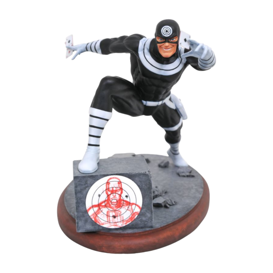 Target acquired! Daredevil baddie bullseye gets the Premier Collection treatment with this all-new 9-inch statue! With one foot up on a Daredevil target and playing cards in both hands, Bullseye is ready to take out whoever he needs to in order to get into your collection. Limited to only 3,000 pieces, it comes packaged with a numbered certificate of authenticity in a full-color box. Designed by Caesar and Clayburn Moore, hand-sculpted by Clayburn Moore. View all