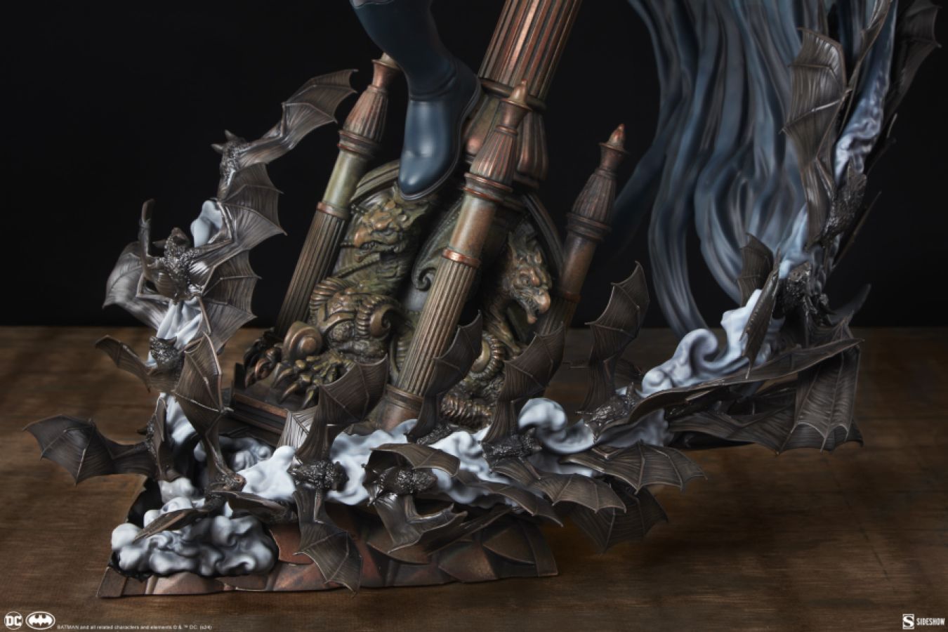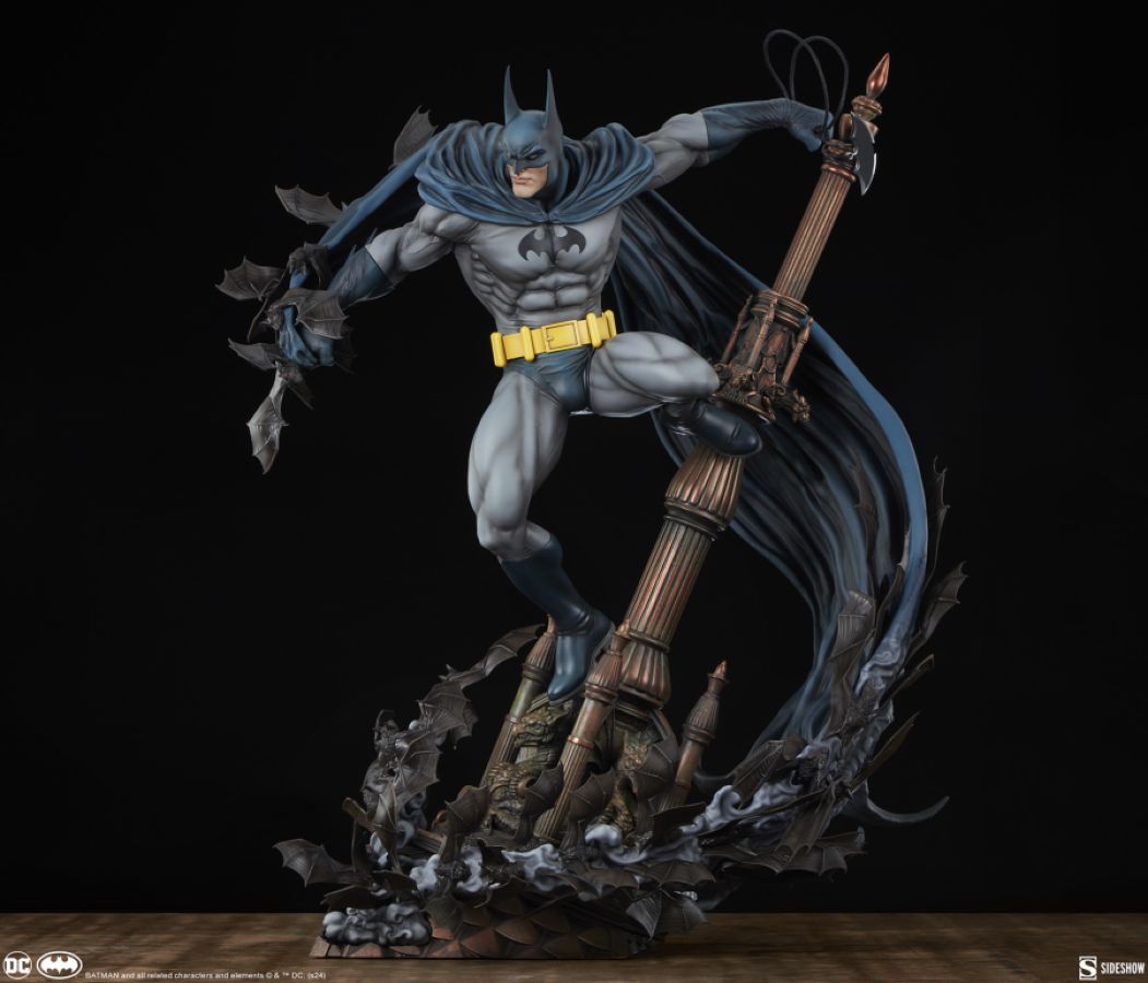 Measuring 27" tall, 21" wide, and 20" deep, the Batman Premium Format Figure finds Gotham City's nocturnal super sleuth balanced at the summit of a church steeple. Bruce Wayne's alter ego searches for clues to help him solve his current case while he grapples onto a crooked spire far above the city streets. As a colony of bats swarms around and morphs into his long, billowing cape, Batman becomes a prowling creature of the night who is able to stalk any enemy through the deepest shadows and the most dizzying heights.