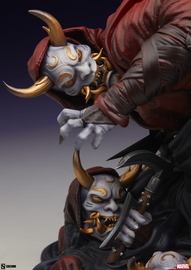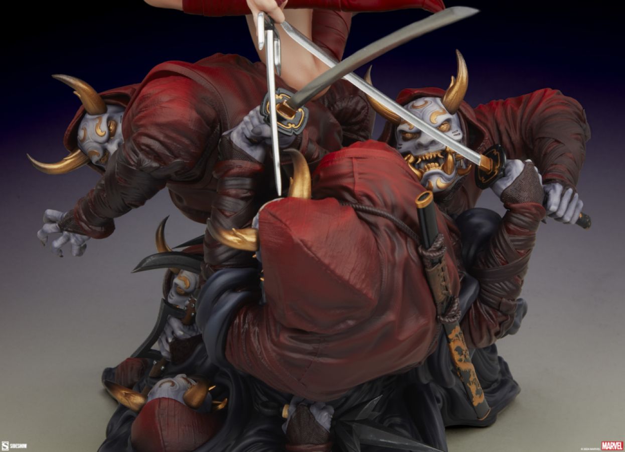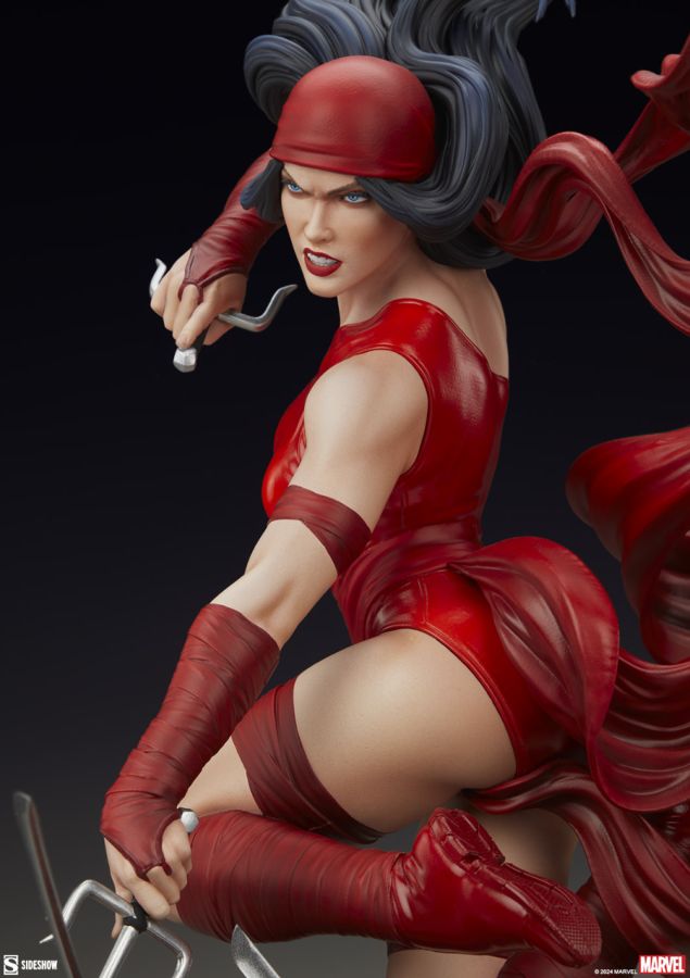 "I am Elektra Natchios. Not even the stars are safe in the sky." Sideshow presents the Elektra Premium Format Figure, inspired by The Hand's living weapon. This killer Marvel collectible embodies all the grace and power of a master assassin at her peak. The Elektra Premium Format Figure measures 24" tall, 13" wide, and 13" deep as Elektra Natchios plunges fearlessly into the darkness to face her foes. Strong and sure, Elektra leaps toward a swirling, chimerical mass of demonic assailants. These enemies brandish swords and knives in their clawed hands, and their golden horns, tusks, and teeth are wickedly sharp - but Elektra's silver sai are sharper. This intricate, fully sculpted Elektra Premium Format Figure presents a dauntless fighter in the midst of battle. Elektra wears her classic skintight bodysuit, matching red boots, and crimson wraps on her legs, forearms, and wrists. The trailing ribbons of her scarlet headscarf bursts like blood when she leaps, flaring upwards alongside her ink-black hair. The figure's base features a twisting, terrifying mass of demons swathed in shadows to create a deadly, dynamic display. View all