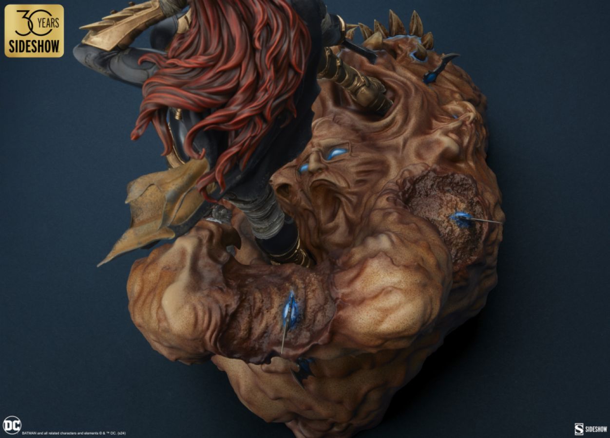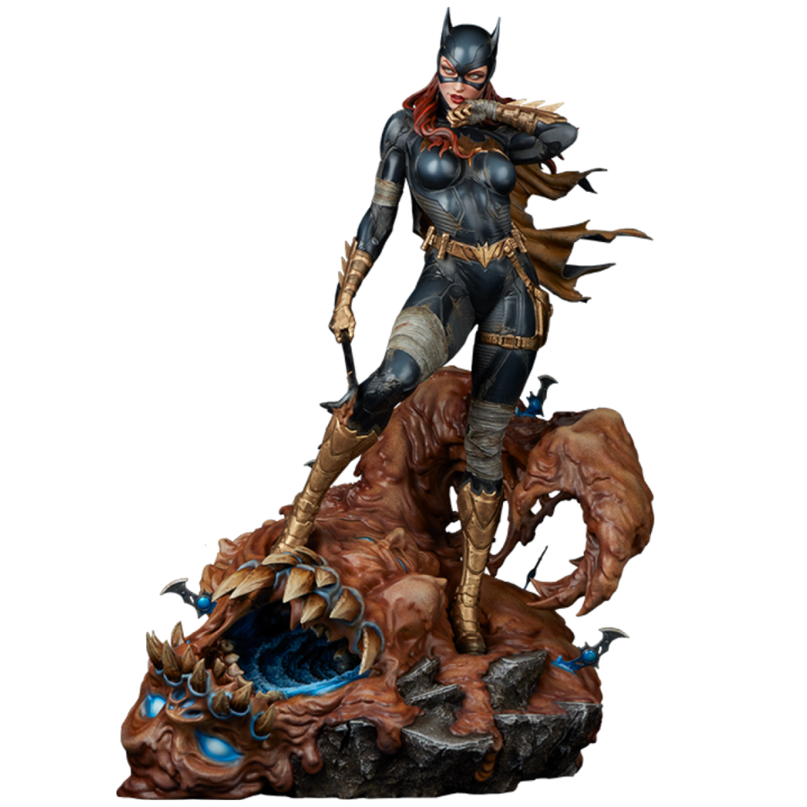 The polystone Batgirl Premium Format Figure measures 21.73" tall by 13.43" wide by 13.9" deep. Inspired by the characters as they appear in DC Comics, this collectible is fully sculpted to capture everything from her costume details down to the varied textures of Clayface's body. Cloth-like bandages wrap Batgirl's arms and legs, while her tactical Batsuit is accented with armoured gold elements like gauntlets, boots, and a utility belt. Batgirl's outfit is weathered to reflect the perils of crimefighting in Gotham City, and a tattered cape flutters off her shoulder. Below her, Clayface alternates between melting, muddy ooze and dried, cracked dirt where the Batarangs have zapped him.