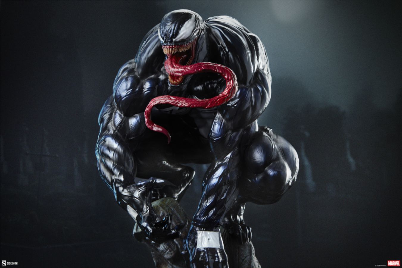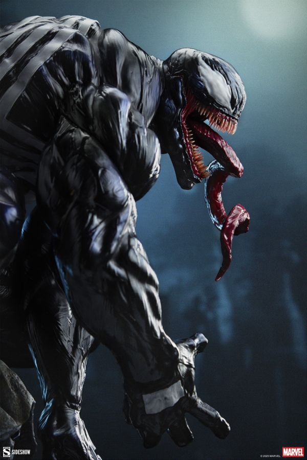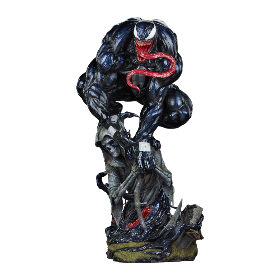 Hatred makes the heart grow fonder! Measuring 23.25" tall, 11.8" wide, and 13.8" deep, the Venom Premium Format Figure finds Eddie Brock and Venom bonded over their shared enemy, Spider-Man. Crouched atop a stone reaper, Venom embodies the chilling message of death and darkness imbued in that decrepit statue. Swirling, shadowy symbiotes swarm below the alien antihero like tar spreading over the graveyard, devouring everything in their path - just as Venom will do with those sharp teeth and terrifying tongue.
