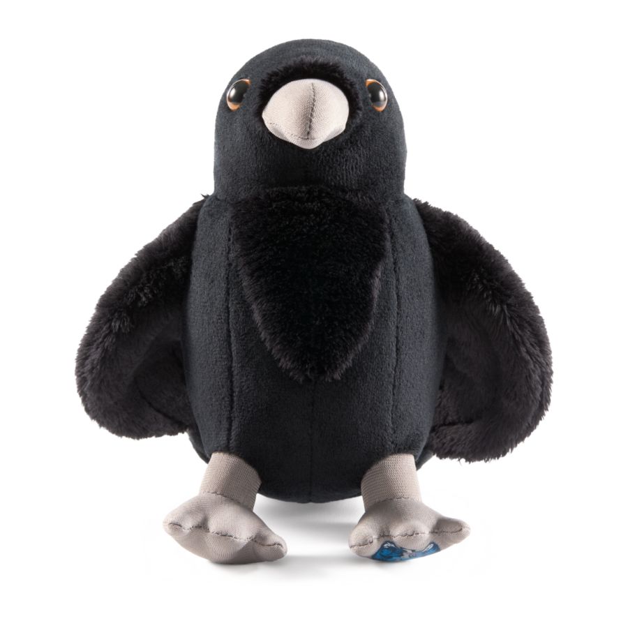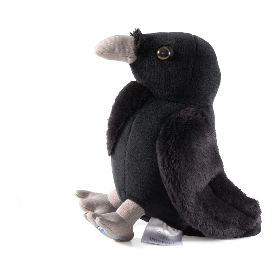 This raven plush is approximately 8" tall and features a Ravenclaw crest under the birds foot.