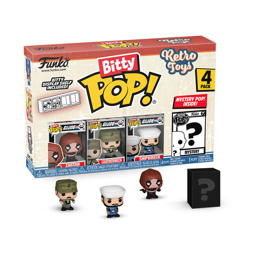 This 4-pack includes Bitty Pop! Zartan, Bitty Pop! Leatherneck, Bitty Pop! Shipwreck and a mystery Bitty Pop! figure.
