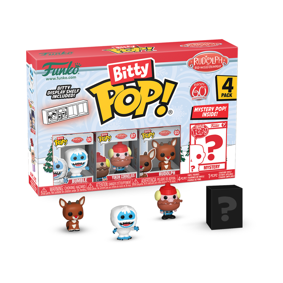 This 4-pack includes Bitty Pop! Bumble, Bitty Pop! Yukon Cornelius, Bitty Pop! Rudolph (Sitting), and a mystery Bitty Pop! figure.
