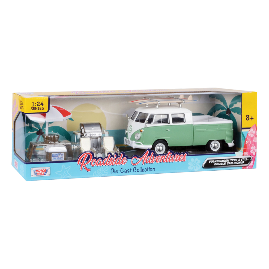 The Roadside Adventures 1:24 Scale Volkswagen Type 2 Double Cab Pickup Die-Cast Vehicle captures classic retro styling with detailed craftsmanship. Featuring durable die-cast construction and realistic detailing, its perfect for display or collection.