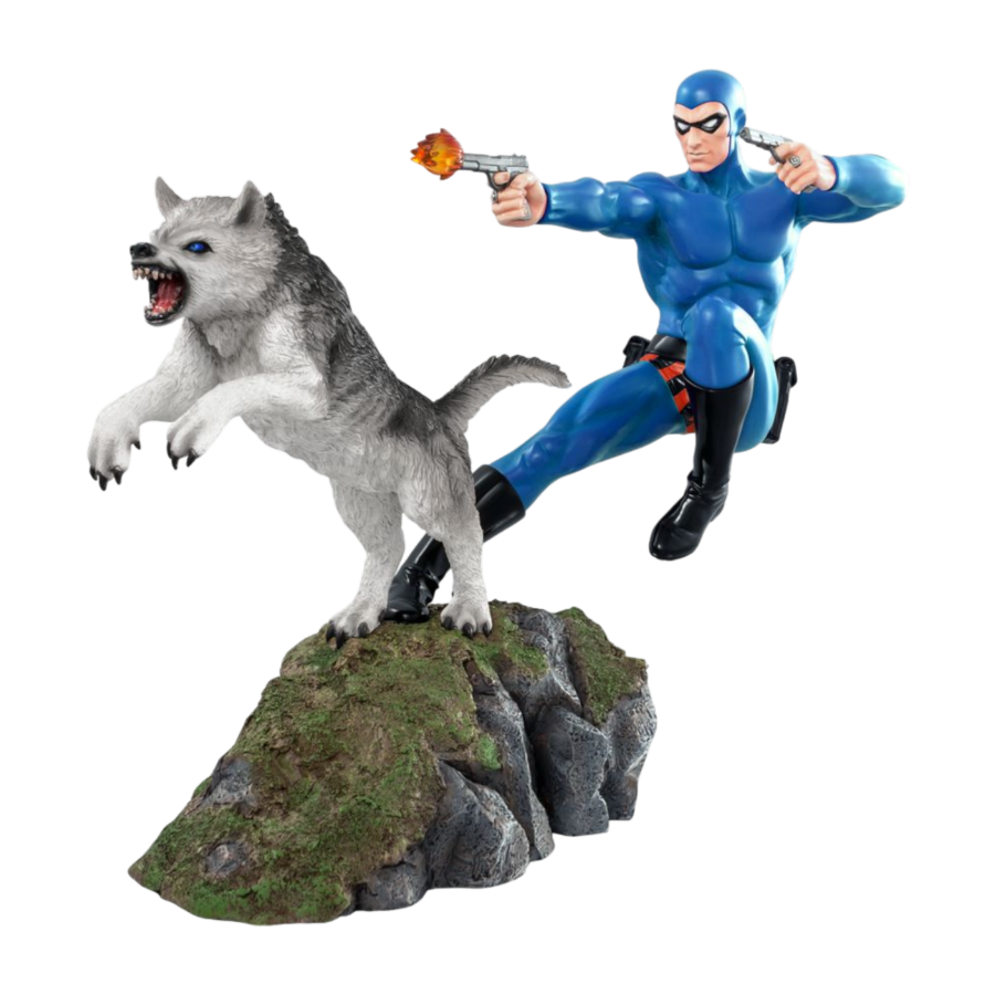 "When the Phantom moves, he shames the lightning..." From the moment fans first set eyes on the ghost that walks in his 1939 comic debut, they were captivated by the mysterious costumed crime-fighter. Unlike other superheroes, the Phantom relies entirely on his strength, intelligence and enigmatic immortality. This breathtaking 1/6th scale piece captures every detail of the unforgettable Phantom in the midst of a battle with an unknown enemy. Dual-wielding twin pistols as he and his loyal wolf, Devil, vault over the harsh jungle terrain. Featuring a removable gun blast for adaptable display, this statue is strictly limited, so fans of the Ghost Who Walks must act quickly before he disappears for good! Edition Size - 75 View all