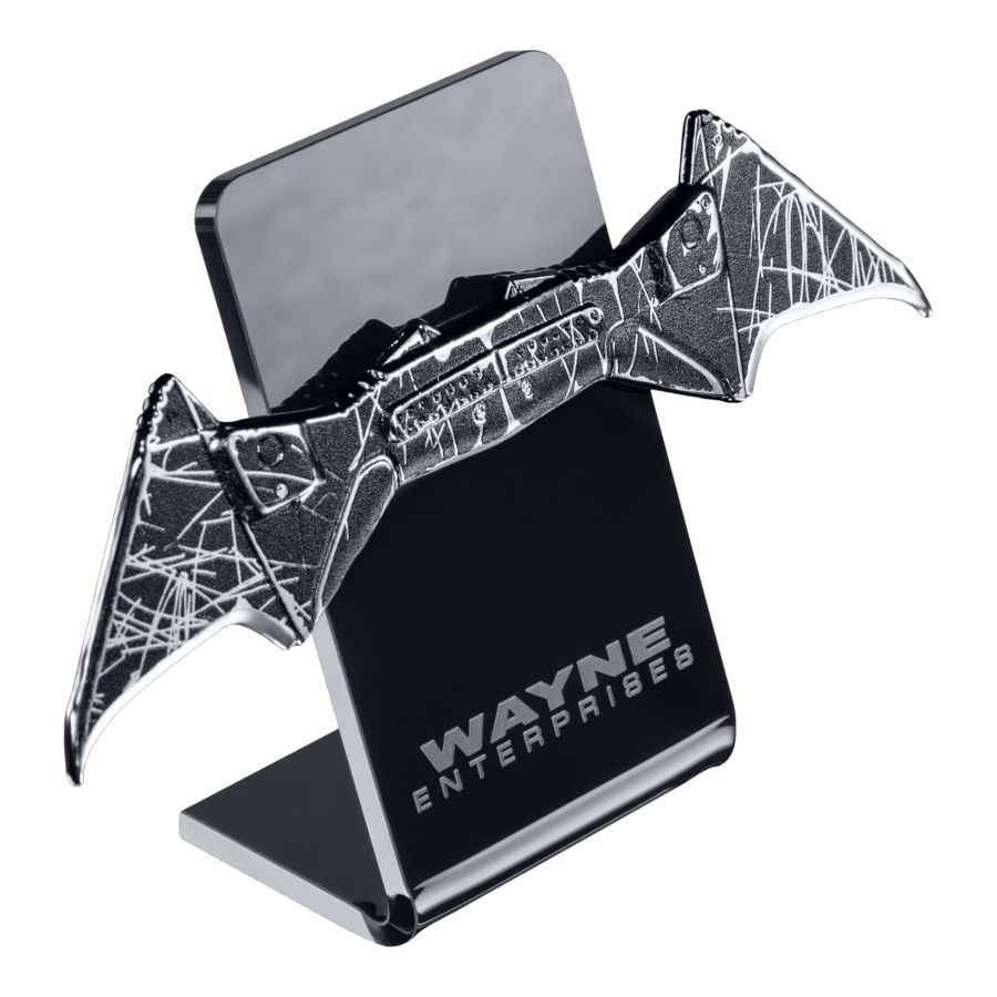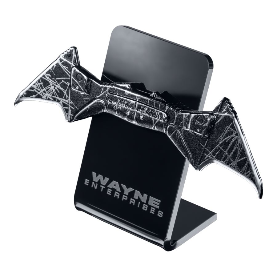 A discreet magnet is built into the back, allowing the piece to securely attach to its black perspex display stand emblazoned with the Wayne Enterprises logo.