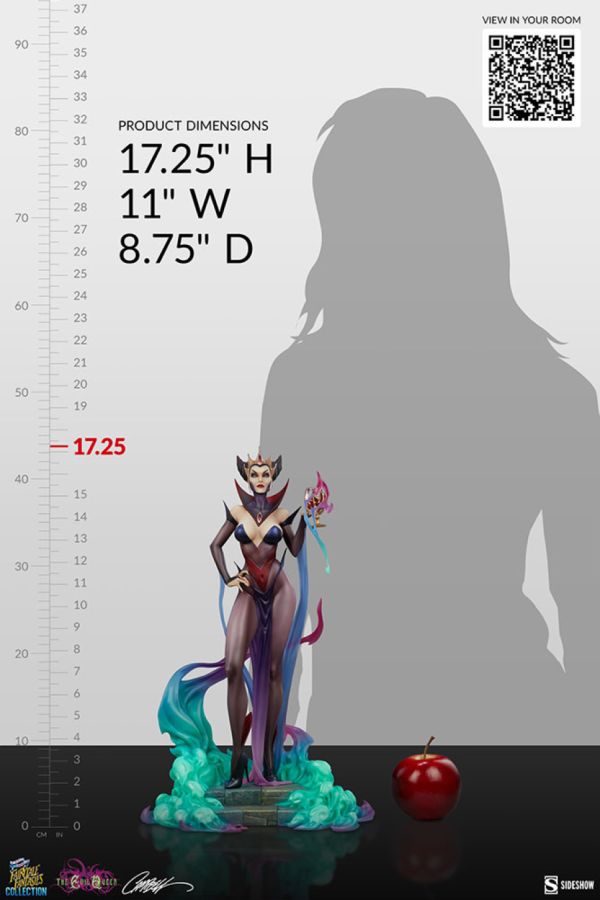 Sideshow presents the Evil Queen Statue, the fairest and fiercest femme fatale to join J. Scott Campbell's Fairytale Fantasies Collection! Working closely with fan-favorite artist J. Scott Campbell, Sideshow has translated his iconic art style into a stunning three-dimensional celebration of reimagined classic fairytale characters like the Evil Queen from the story of Snow White, bringing vanity and villainy to the collection with a pin-up twist. The polyresin Evil Queen Statue measures 17.25" tall and 11" wide as the ravishing royal stands on the stone staircase of her throne room. In her hand she holds a goblet of wine with swirls of magic spilling over the top. Prepared to poison the rival to her title of Fairest in the Land, her colorful and caustic brew forms smoking skulls at her feet, with vibrant pinks and blues fading into a noxious green. The Evil Queen is fully sculpted and dressed in dark reds and purples, with a plunging bodice and gossamer skirts and sleeves trailing from her unique ensemble. A gold crown atop her head serves to remind everyone exactly who rules around here. You can't spell Fairytale Fantasies without "fairest" - it's true, we checked! Appease her royal highness and add J. Scott Campbell's Evil Queen Statue to your collection today. View all