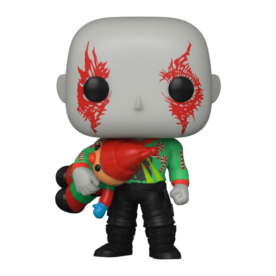 Deck the galaxy this holiday season with Pop! Drax from Marvel Studios The Guardians of the Galaxy Holiday Special. Pop! Drax, ,armed with a toy elf, looks ready for festive heroic fun. Join him for action-packed, holiday-themed adventures through the cosmos.
