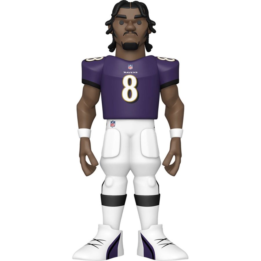 Score a touchdown for your National Football League collection with the new Funko GOLD Lamar Jackson premium vinyl figure. This 12-inch tall collectible of Lamar Jackson has him dressed in his Baltimore Ravens home game uniform. GOLD is the perfect way to commemorate some of your favorite NFL players in your collection, and each figure comes in a sleek, display-ready box that is easy to stack with other GOLD collectibles. There's a 1 in 4 chance you may find the chase variant of Lamar Jackson in his away game uniform. Vinyl figure is 12-inches tall. View all