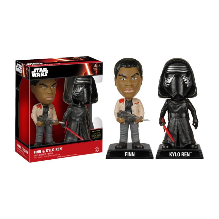 Finn & Kylo Ren From the 2015 movie Star Wars: Episode VII - The Force Awakens Finn as portrayed by John Boyega Kylo Ren as portrayed by Adam Driver Made of plastic/vinyl 7" tall View all