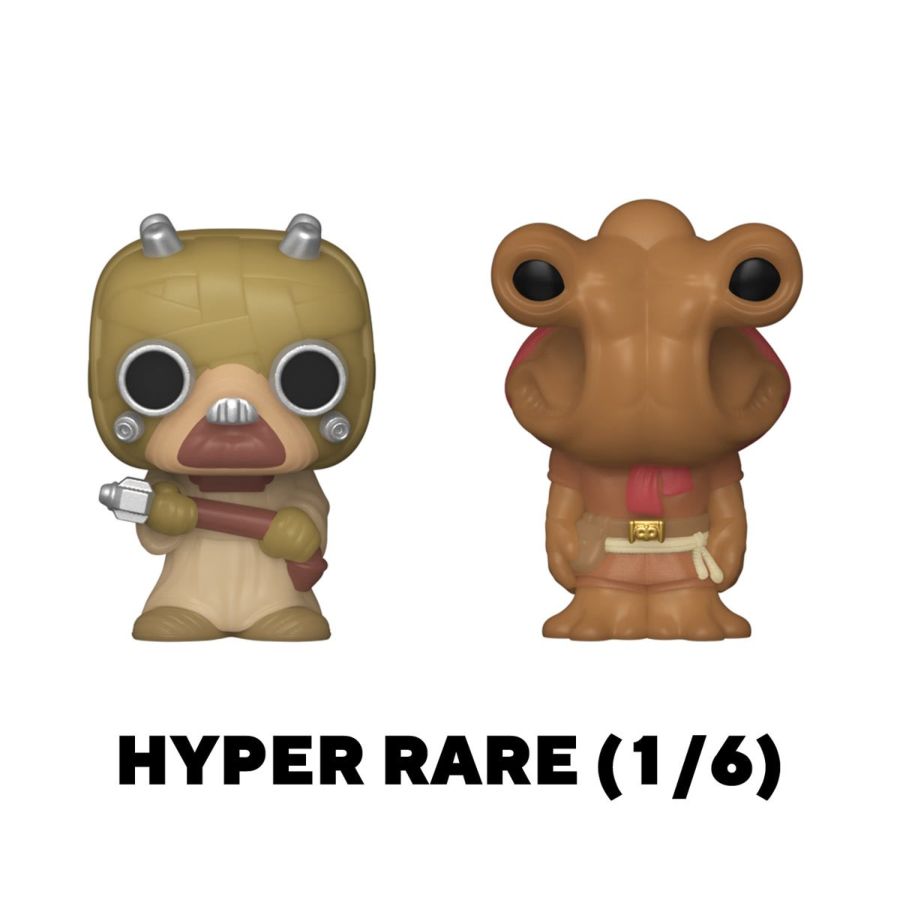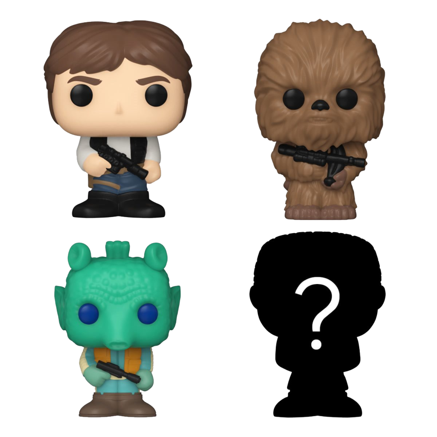 Your favorite Pops! have been shrunk into Bitty Pops! Expand your Star Wars collection with this assortment of Bitty Pop! figures featuring the most stellar characters in the galaxy! This 4-pack includes Bitty Pop! Han Solo, Bitty Pop! Chewbacca, Bitty Pop! Greedo, and a mystery Bitty Pop! figure. The possible mystery Bitty Pops! are Hyper Rare (1/6) Stormtrooper (chrome), Hyper Rare (1/6) Grand Moff Tarkin, Rare (1/3) Tuskan Raider, and Rare (1/3) Hammerhead. Bitty Pops! are packaged in hard acrylic cases with detachable bottom lids. Detachable bottom lids double as acrylic bases, to which the Bitty Pop! figures are adhered. Vinyl figures are approximately 0.9-inches tall. Four figures per single package purchase.