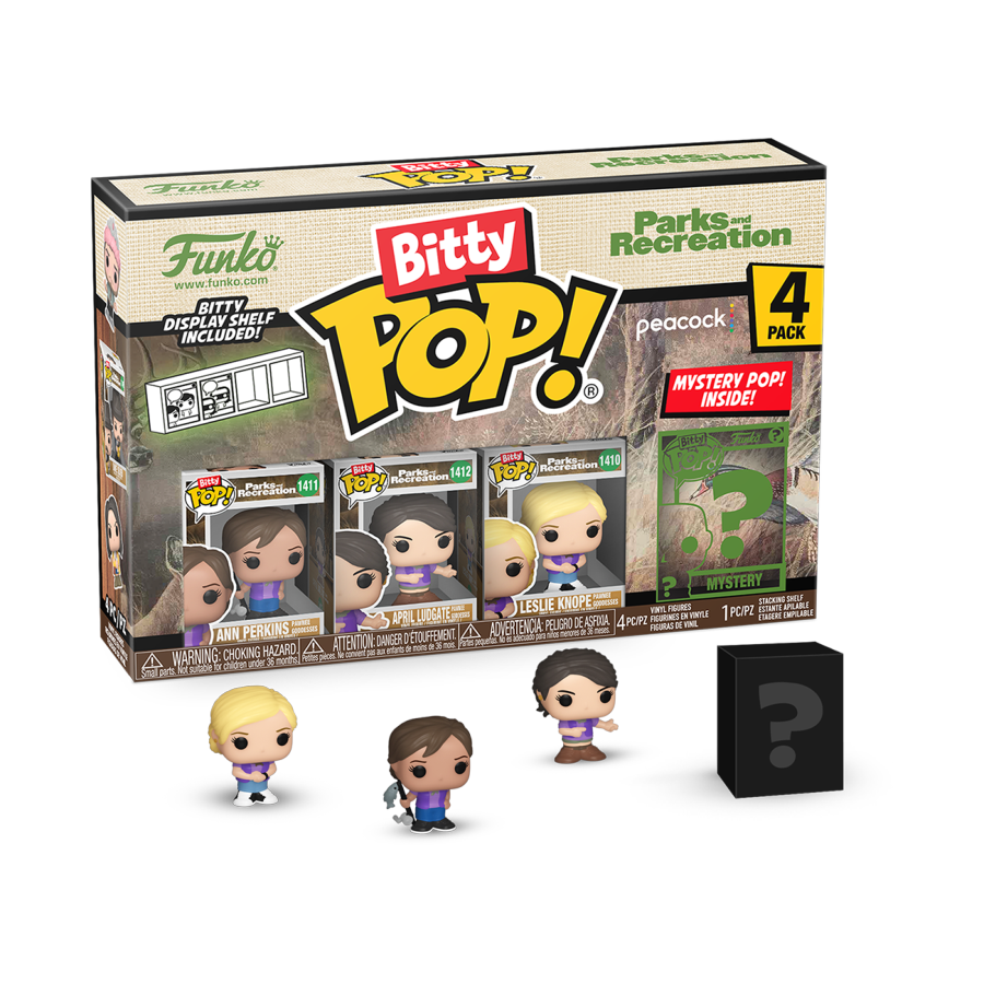 This 4-pack includes Bitty Pop! Ann (Goddess), Bitty Pop! Leslie (Goddess), Bitty Pop! April (Goddess), and a mystery Bitty Pop! figure.
